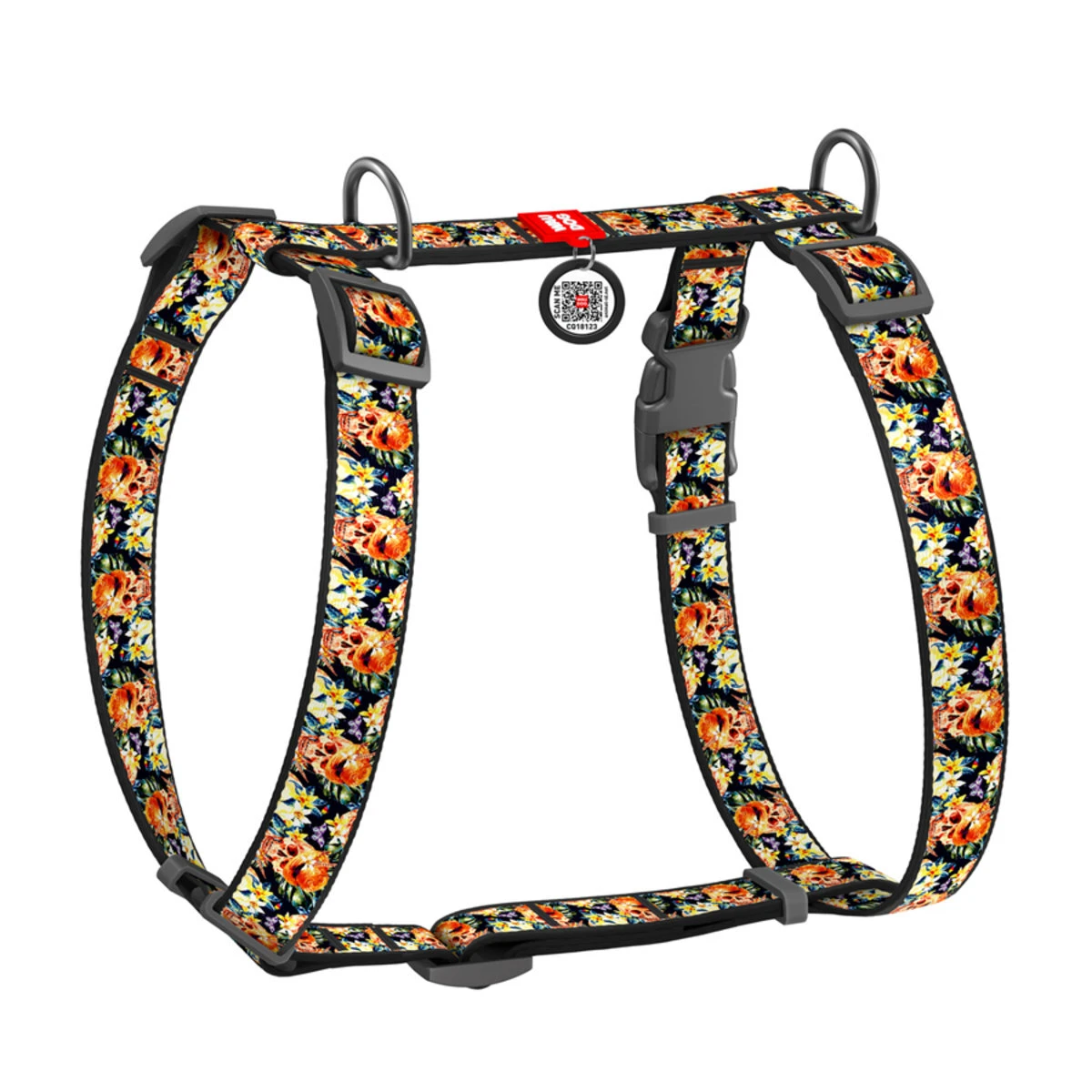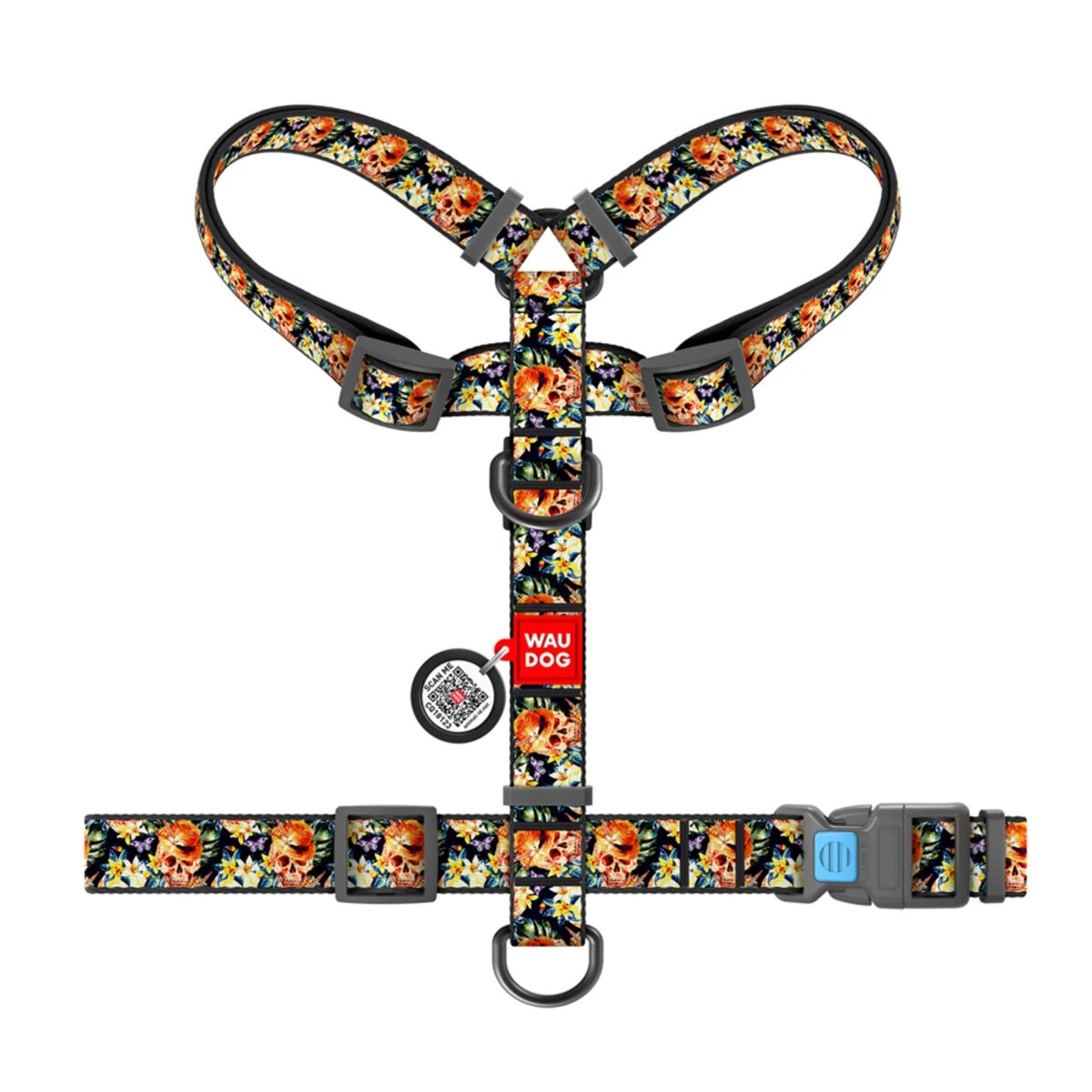 Анатомічний H-образний нашийник для собак WAUDOG Nylon з QR-паспортом, малюнок "Гламурні черепи", пластиковий фастекс, М, Ш 20 мм, А 40-70, В 50-80