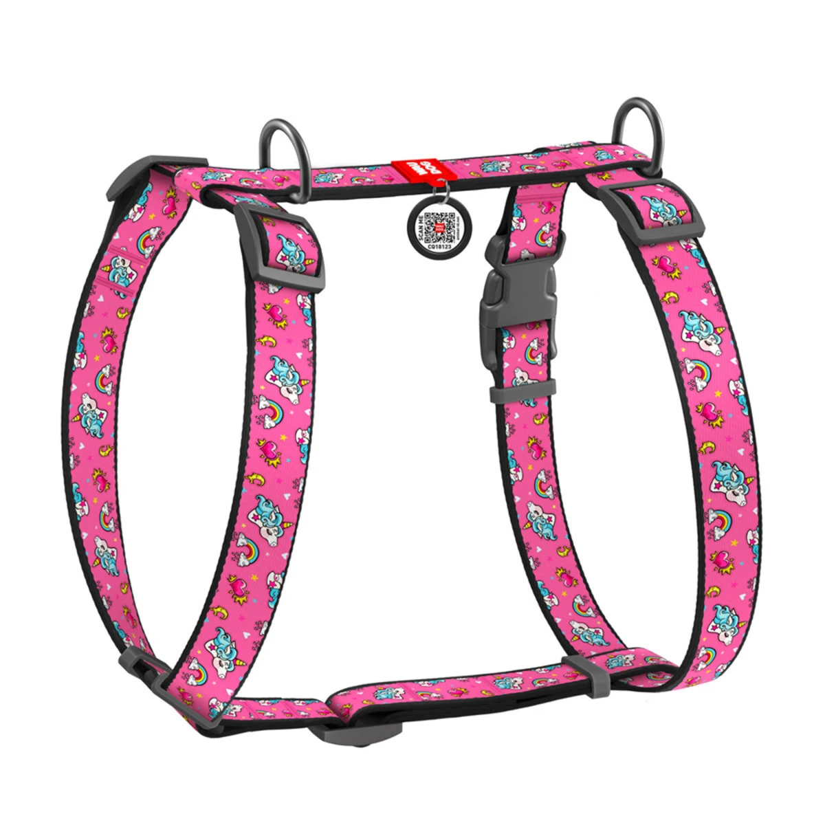 Анатомічний H-подібний нашийник для собак WAUDOG Nylon з QR-паспортом, малюнок "Єдинороги", пластиковий фастекс, L, Ш 25 мм, А 50-90, В 60-100