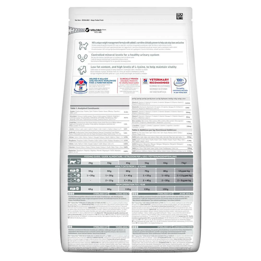 Сухий корм Hill's Science Fel Adult Sterilised Cat рекомендований для кастрованих котів та стерилізованих котів від 1 до 6 років. Унікальна формула для контролю ваги тіла допоможе стерилізованій кішці / кастрованому коту залишатися струнким. Давати щоденно з розрахунку ваги та фізичної активності улюбленця. Дотримуйтесь норм годування, вказаних у таблиці на упаковці, але також враховуйте індивідуальні потреби вашого кота. При переході з одного корму на інший рекомендується робити це поступово, щоб організм тварини зміг адаптуватися до нового раціону. Поступово додавайте новий корм до попереднього, щоденно збільшуючи кількість нового корму та зменшуючи кількість попереднього, поки не відбудеться повна заміна. В середньому процес переходу на новий корм триває 5-7 днів. Корм рекомендується пересипати в спеціальний контейнер з кришкою для зберігання харчових продуктів.