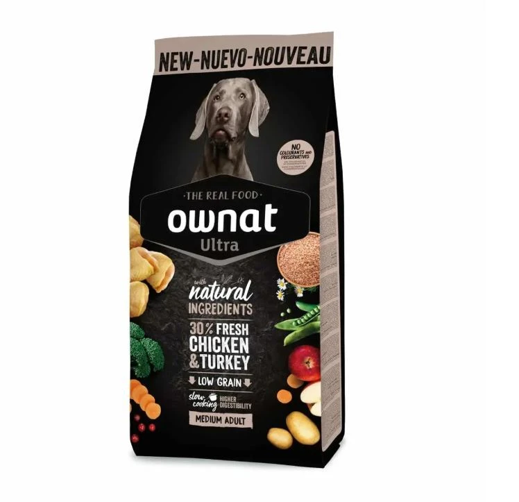 Ownat Ultra Adult Medium Chicken — це повнораціонне харчування суперпреміум-класу, розроблене спеціально для дорослих собак середніх порід із вагою від 11 до 25 кг. Лінійка Ultra представляє собою вершину еволюції натурального харчування, де акцент зроблено на виняткову свіжість інгредієнтів та унікальну технологію їхньої обробки для підтримки здоров'я та життєвого тонусу вашого улюбленця.