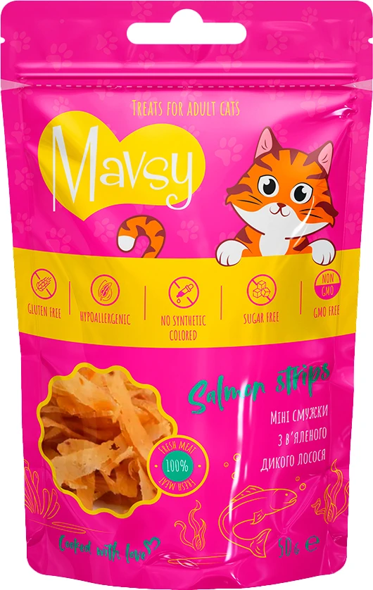 Ласощі для котів Mavsy Salmon Strips - це вишукане ласощі, створене для того, щоб спокушати смакові рецептори вашого котика. Виготовлені з високоякісного лосося.