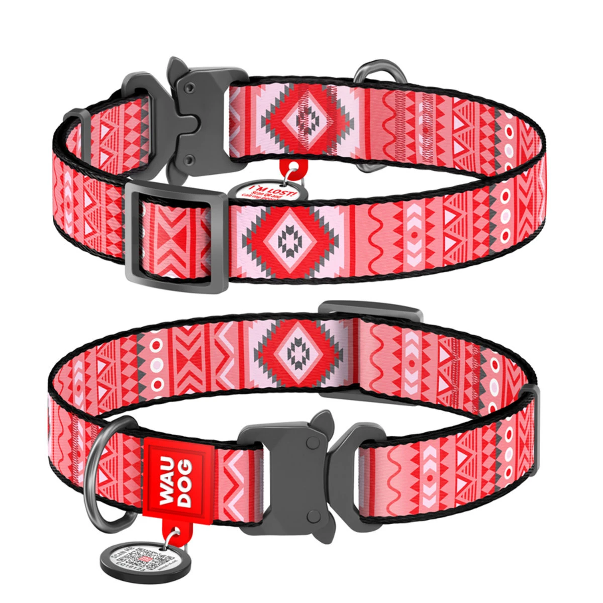 Нашийник для собак нейлоновий WAUDOG Nylon з QR паспортом, малюнок "Етно червоний", металевий пряжка-фастекс, Ш 25 мм, Дл 31-49 см