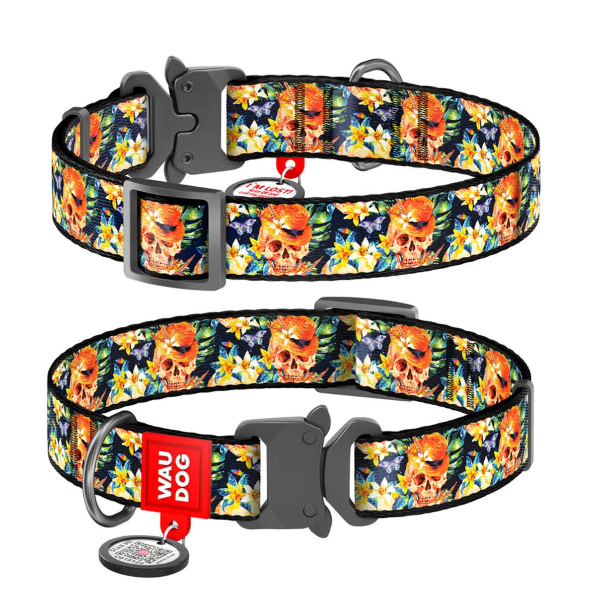 Нашийник для собак нейлоновий WAUDOG Nylon з QR паспортом, малюнок "Гламурні черепи", металевий фастекс, Ш 15 мм, Дл 23-35 см
