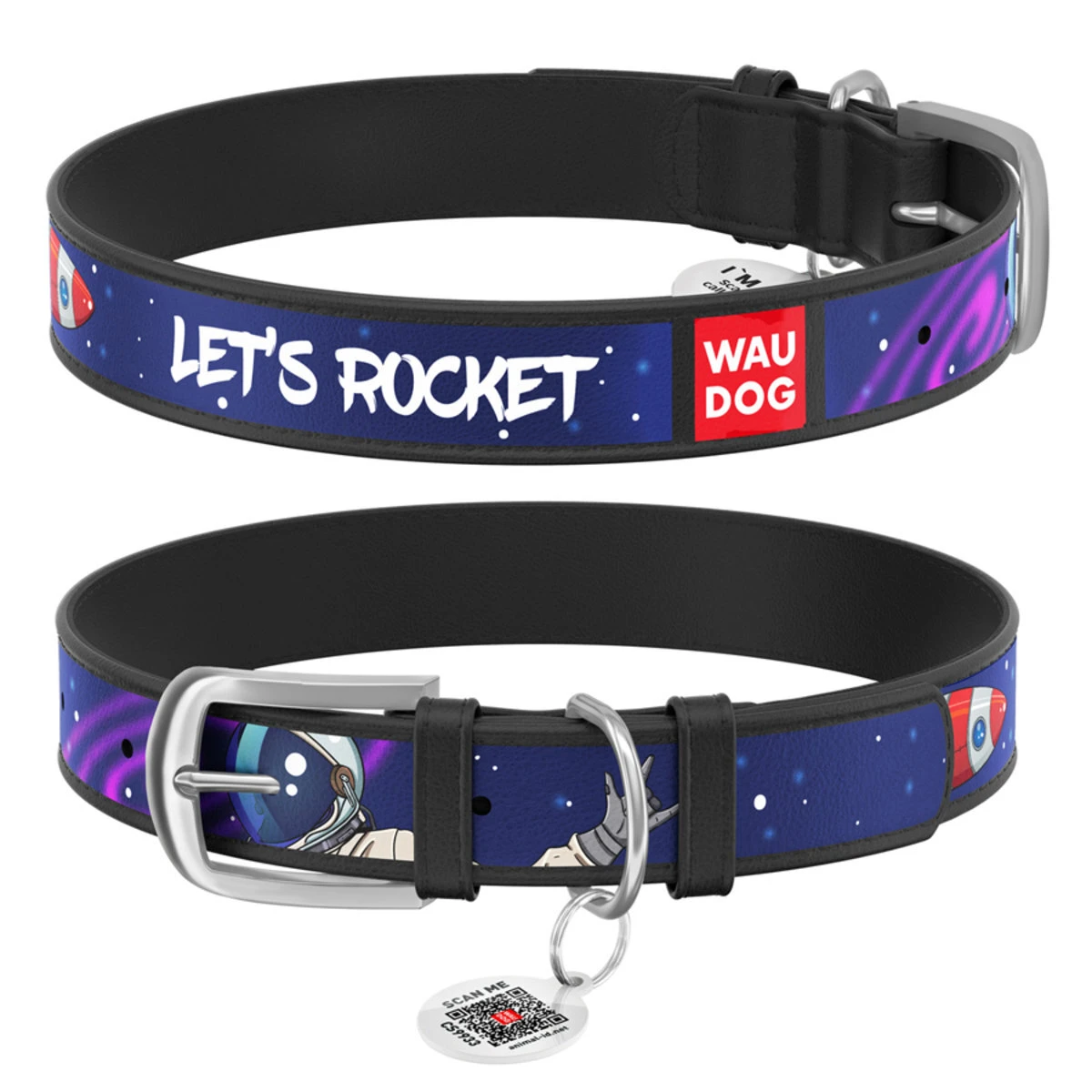 Нашийник для собак шкіряний WAUDOG Design з QR паспортом, малюнок "Космос. Ракета", S, Ш 15 мм, Дл 27-36 см, чорний