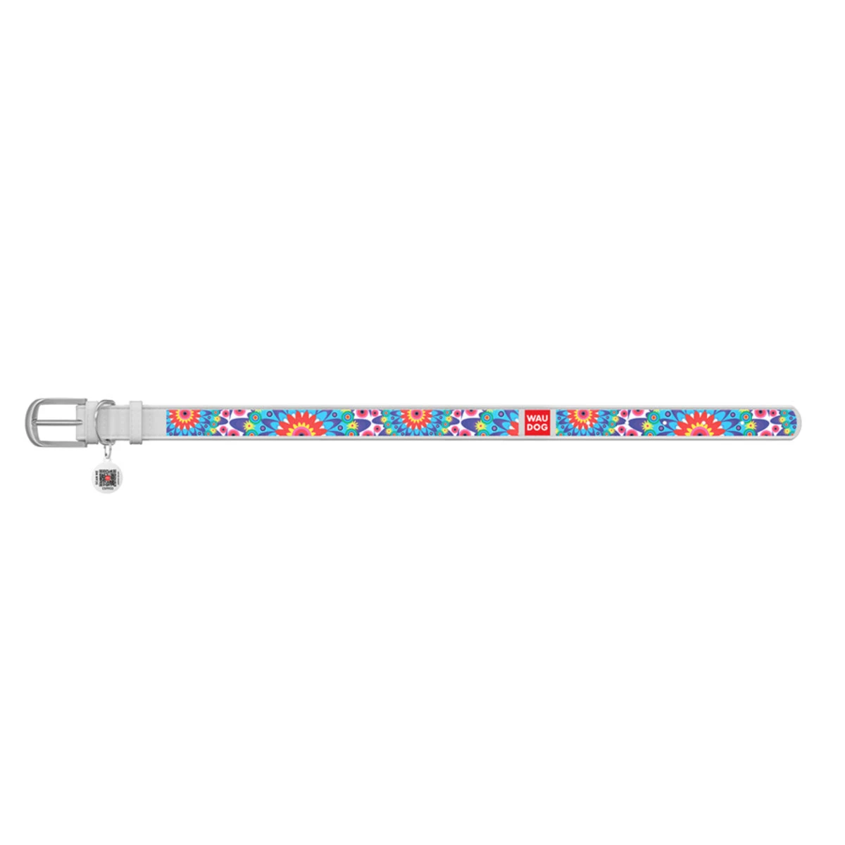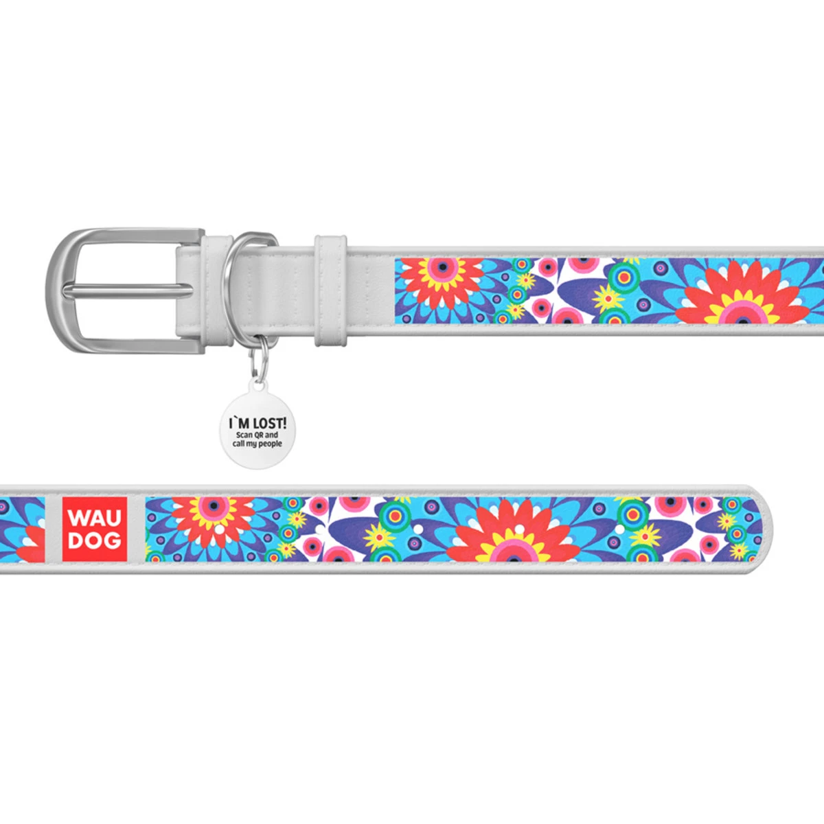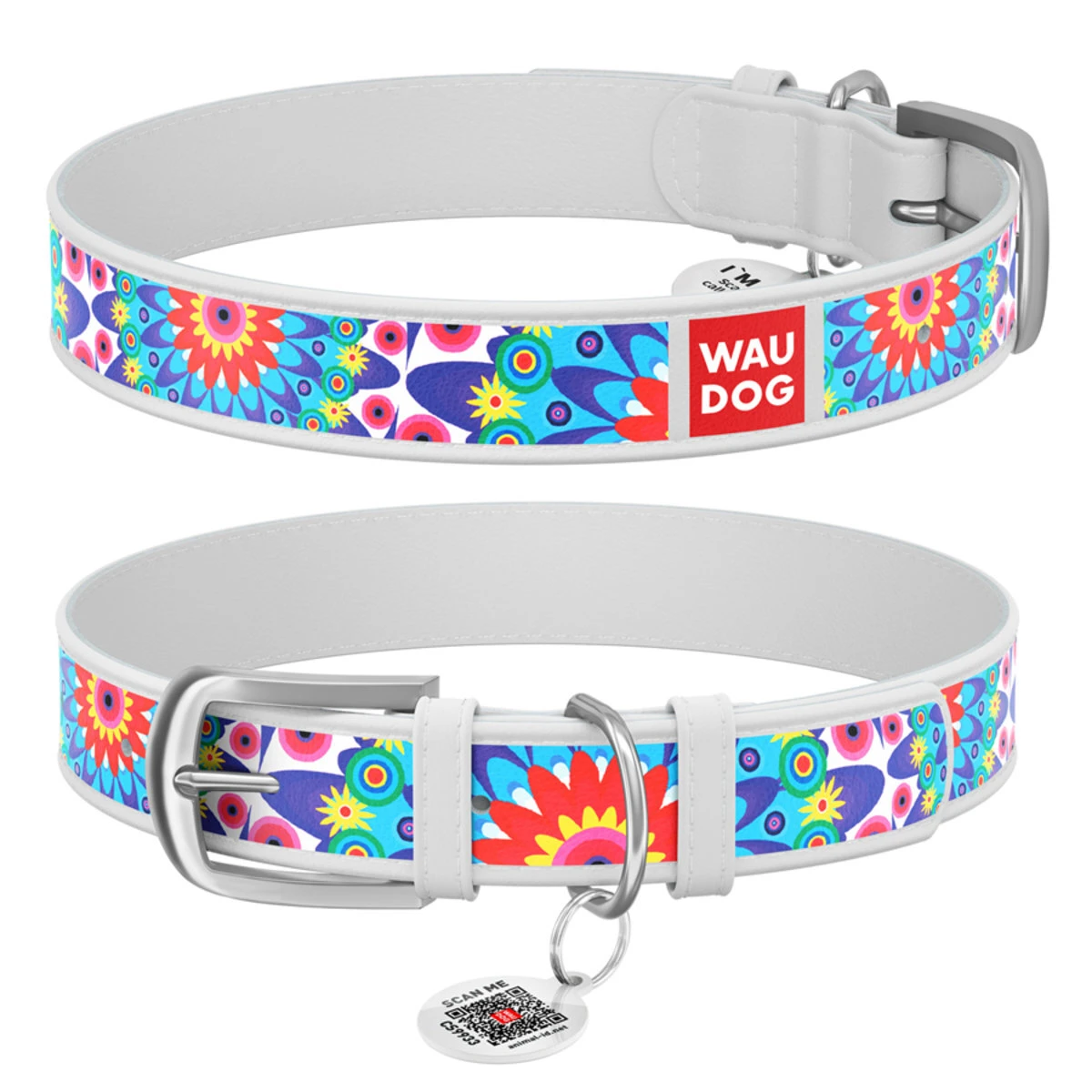 Нашийник для собак шкіряний WAUDOG Design з QR паспортом, малюнок "Квіти", Ш 12 мм, Дл 21-29 см, білий