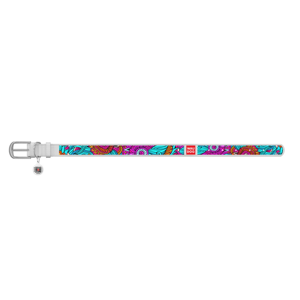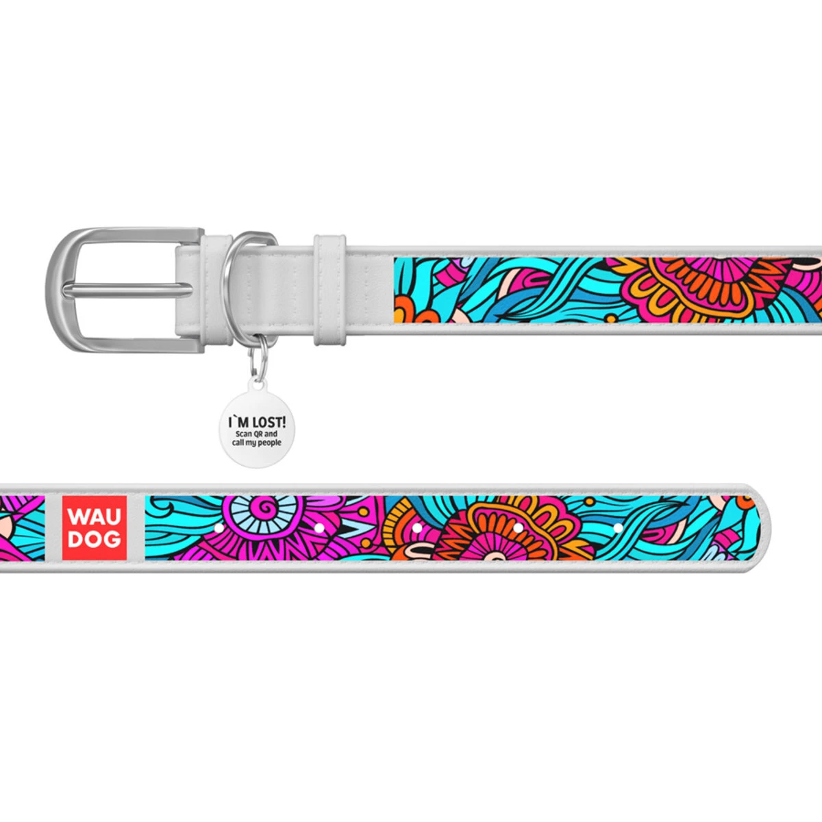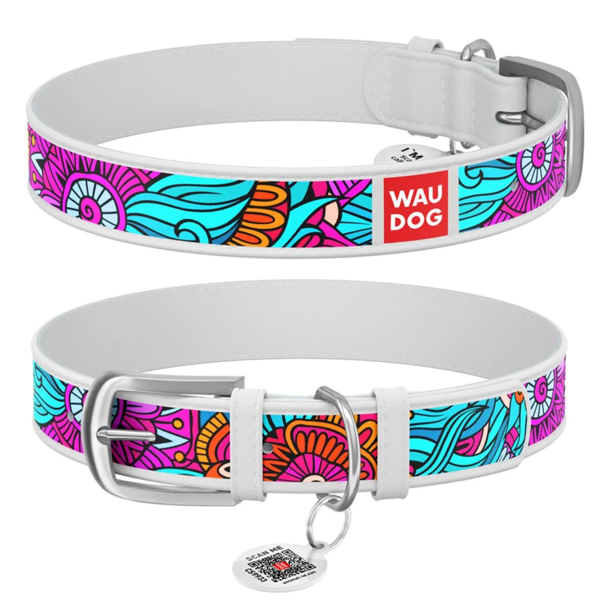 Нашийник для собак шкіряний WAUDOG Design з QR паспортом, малюнок "Літо", Ш 20 мм, Дл 30-39 см, білий