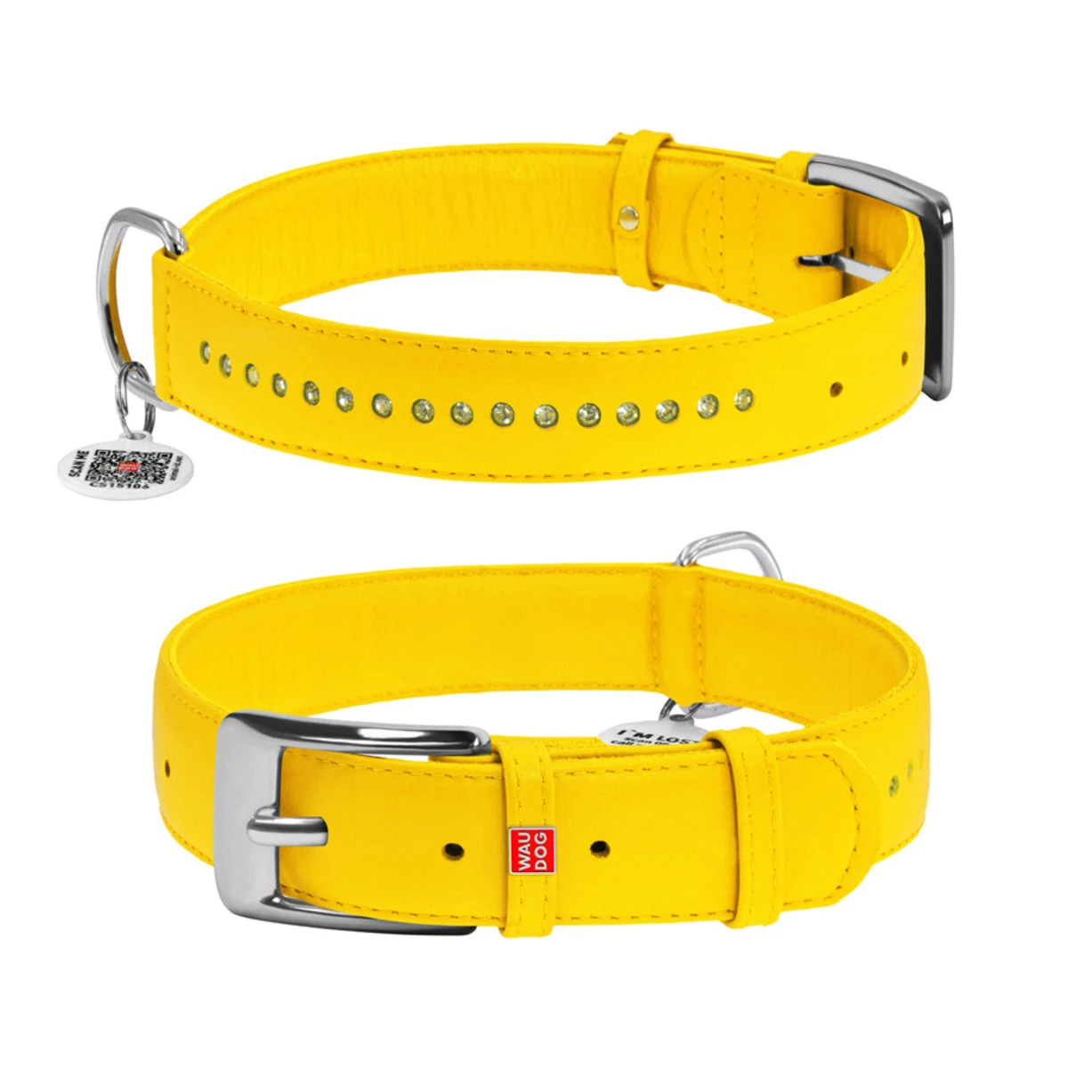 Нашийник для собак шкіряний WAUDOG Glamour з QR паспортом, подвійний зі стразами, Ш 25 мм, Дл 38-49 см, жовтий