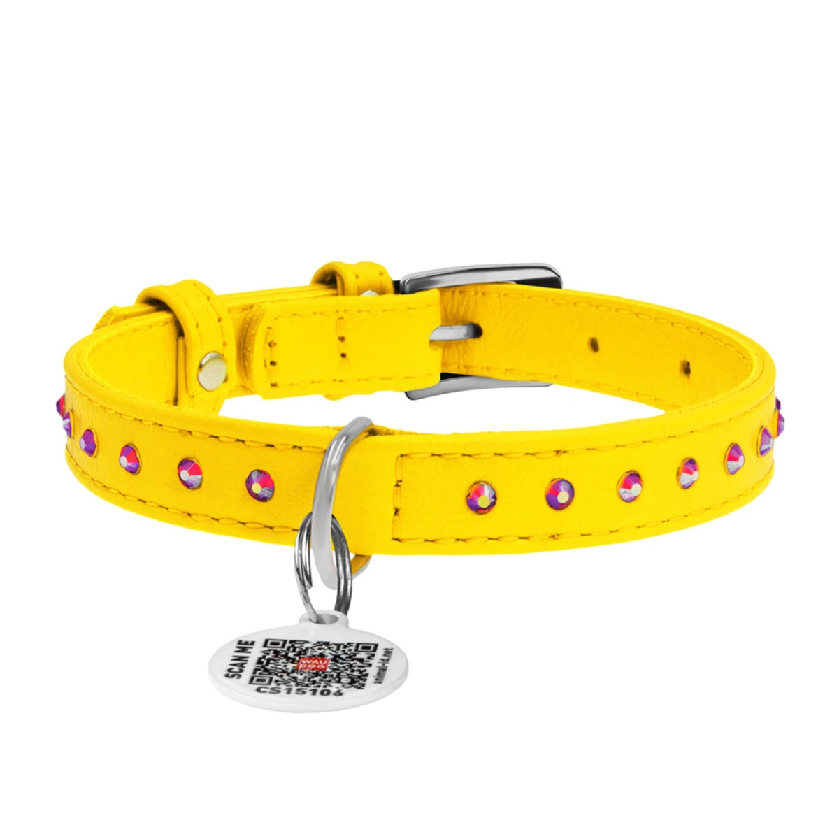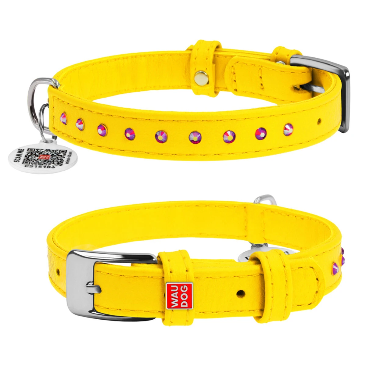 Нашийник для собак шкіряний WAUDOG Glamour з QR паспортом, з клейовими стразами, Ш 12 мм, Дл 21-29 см, жовтий