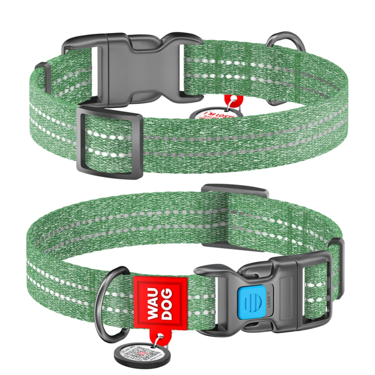 Нашийник для собак з відновленого бавовни WAUDOG Re-cotton з QR паспортом, світловідбиваючий, пластиковий фастекс, Ш 25 мм, Дл 31-49 см, зелений