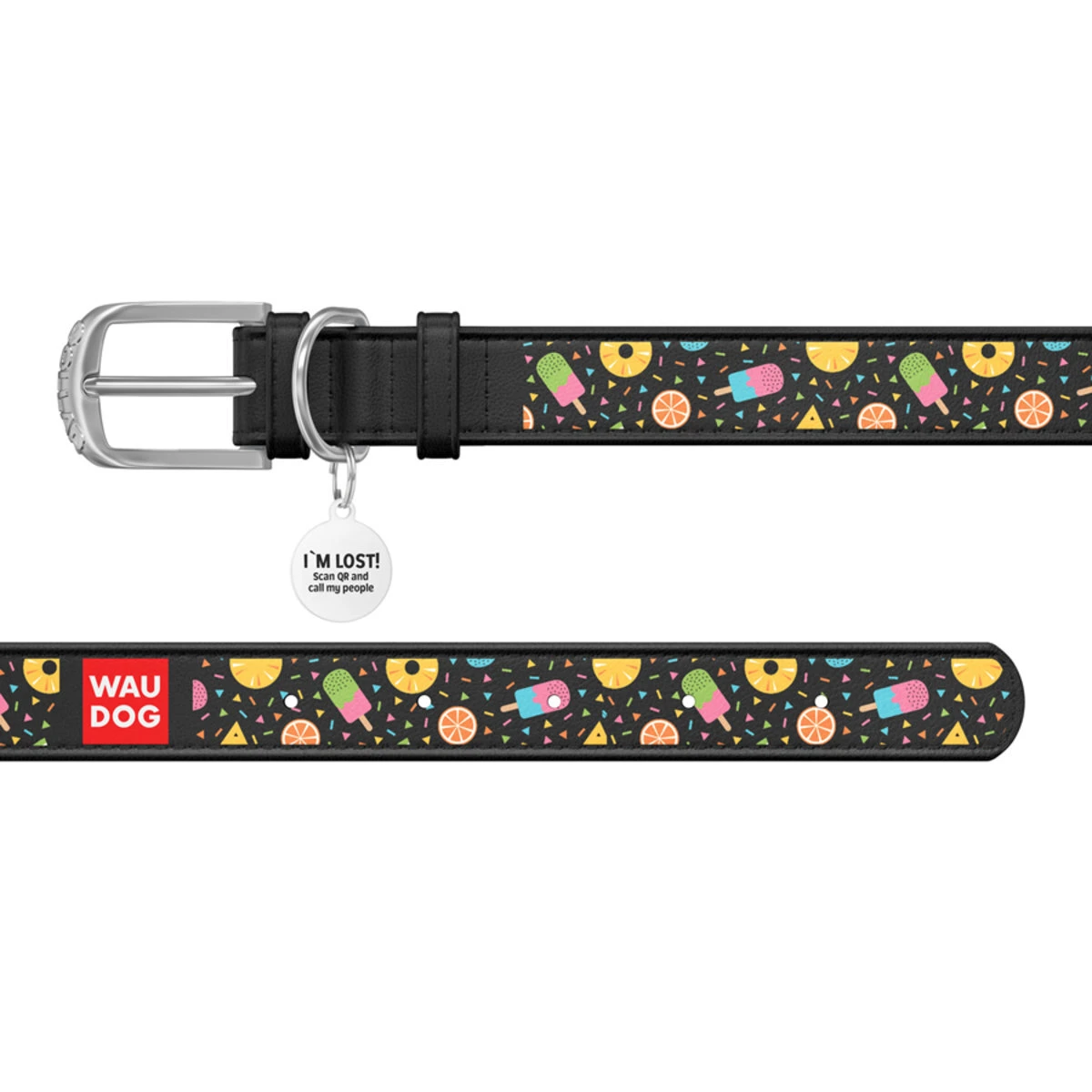 Нашийник WAUDOG Design з малюнком "Ананаси з морозивом", преміум шкіра, металевий пряжка (ширина 20 мм, довжина 30-39 см), чорний