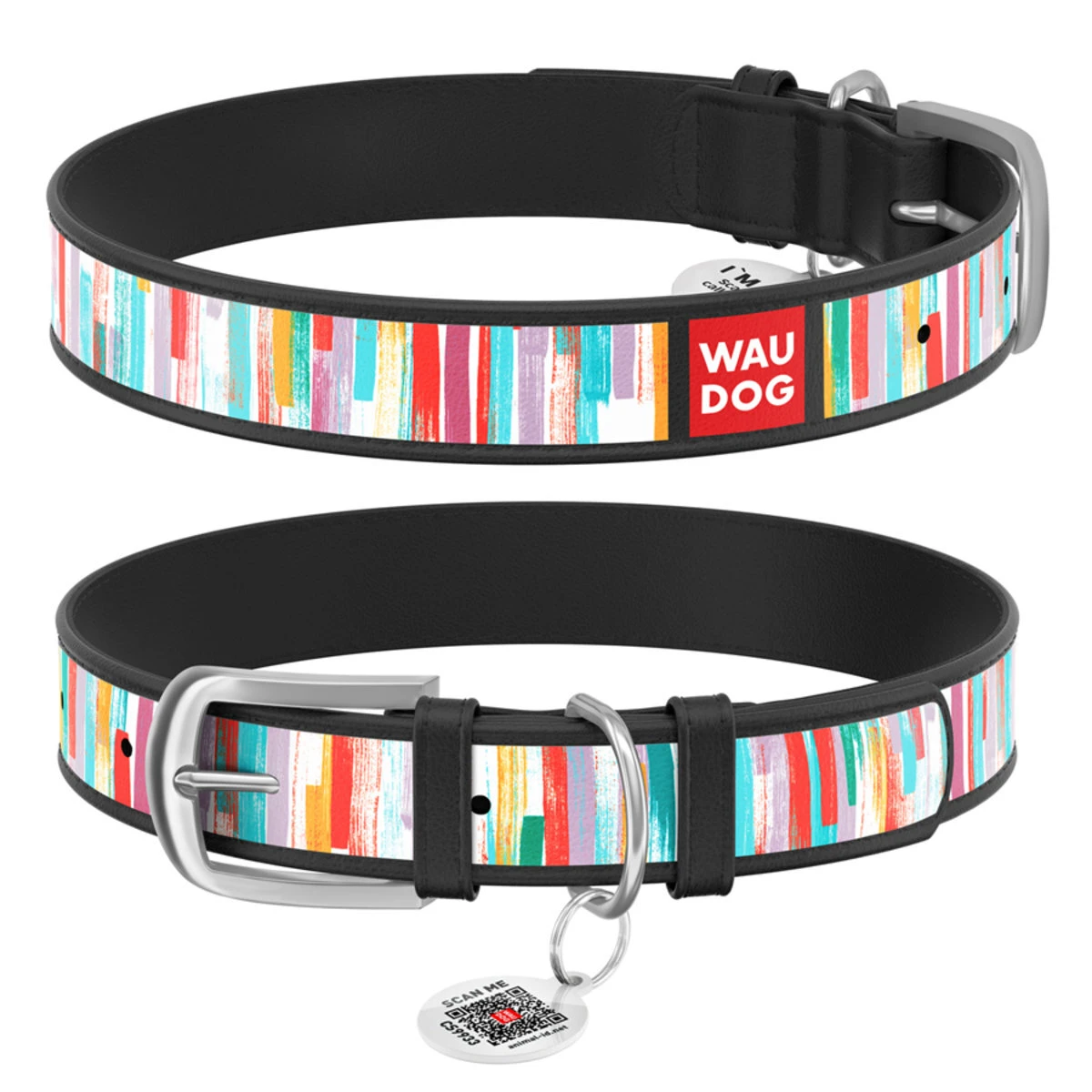 Нашийник WAUDOG Design з малюнком "Яскраві смужки", преміум шкіра, металевий затискач (ширина 20 мм, довжина 30-39 см), чорний