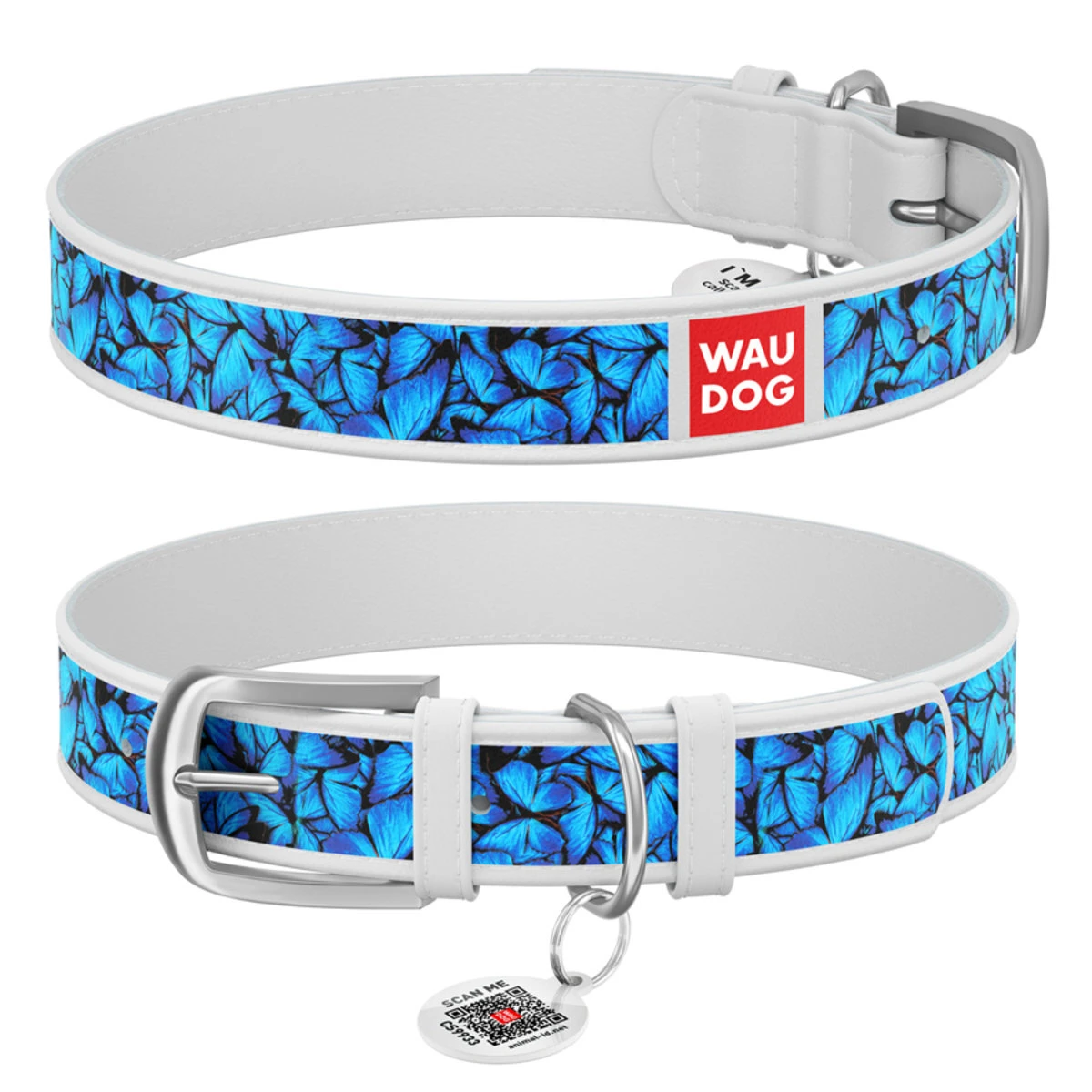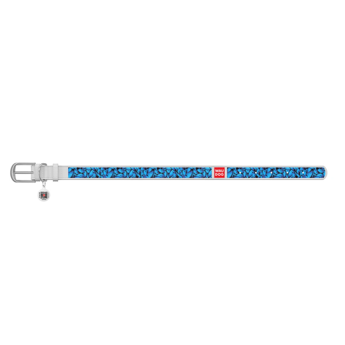 Нашийник WAUDOG Design з малюнком "Блакитні метелики", преміум шкіра, металевий пряжка (ширина 35 мм, довжина 46-60 см), білий