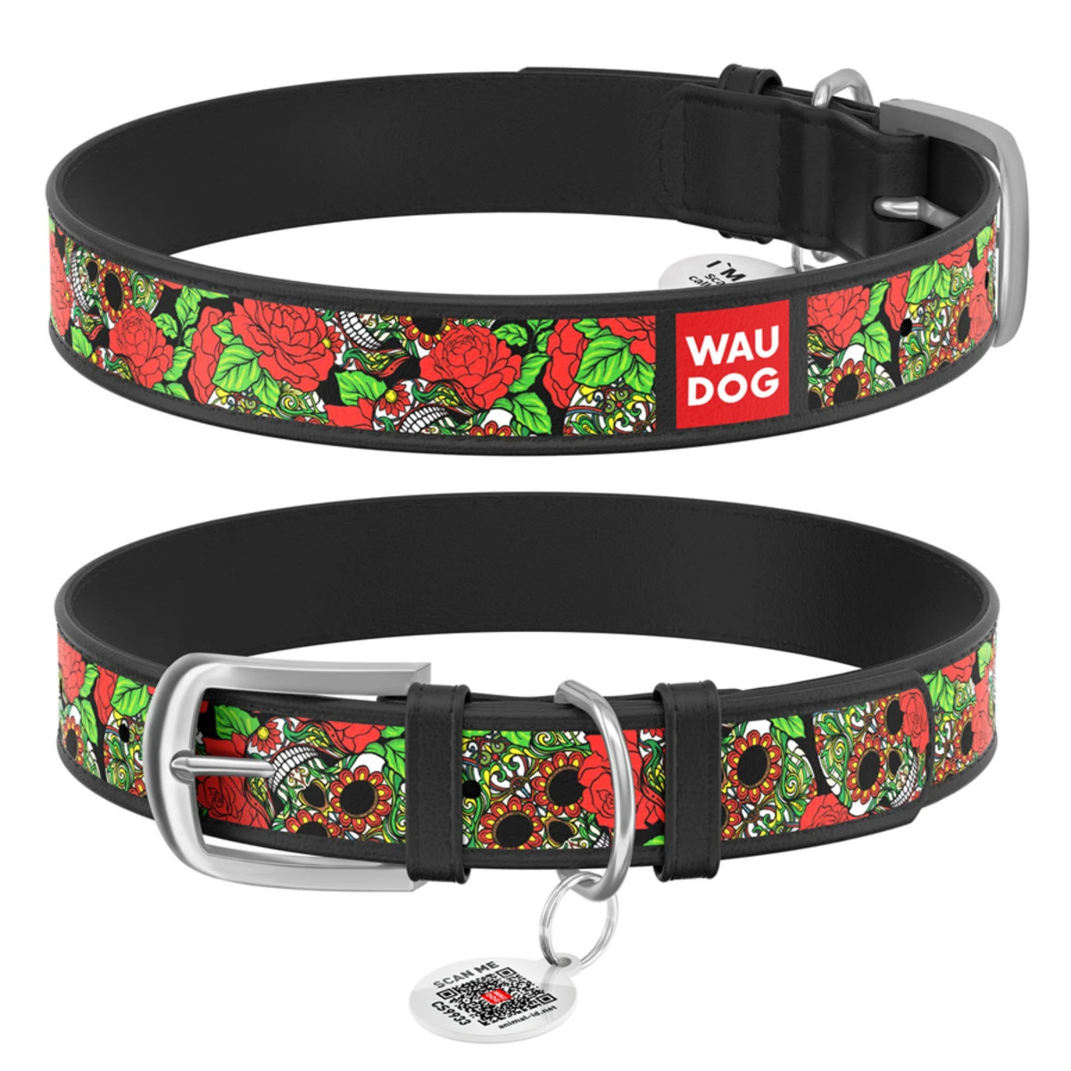 Нашийник WAUDOG Design з малюнком "Черепи та троянди", преміум шкіра, металевий пряжка (ширина 12 мм, довжина 19-25 см), чорний