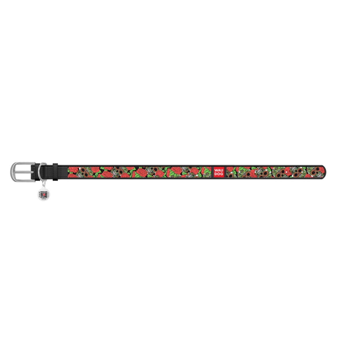 Нашийник WAUDOG Design з малюнком "Черепи та троянди", преміум шкіра, металевий пряжка (ширина 12 мм, довжина 21-29 см), чорний