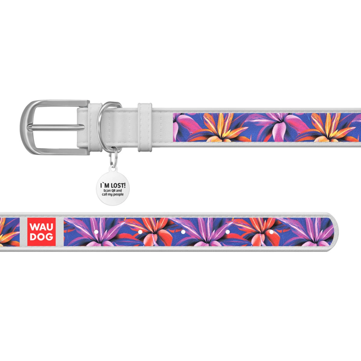 Нашийник WAUDOG Design з малюнком "Фіолетові листя", преміум шкіра, металевий пряжка (ширина 20 мм, довжина 30-39 см), білий