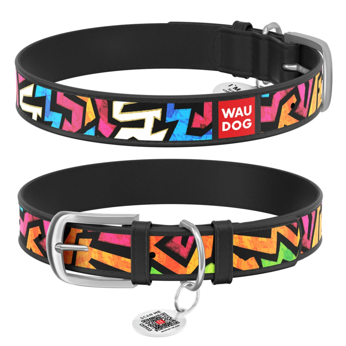 Нашийник WAUDOG Design з малюнком "Графіті", преміум шкіра, металевий затискач (ширина 20 мм, довжина 30-39 см), чорний