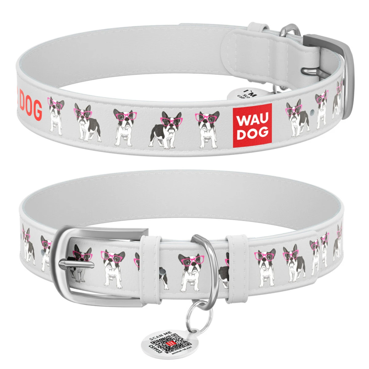 Нашийник WAUDOG Design з малюнком "Хіпстер", преміум шкіра, металевий пряжка (ширина 15 мм, довжина 27-36 см), білий