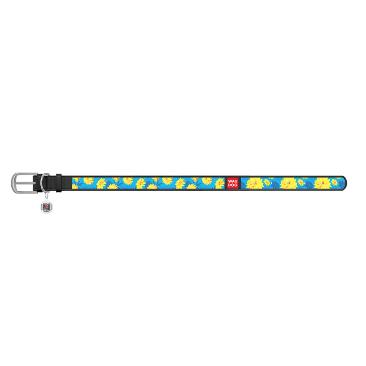 Нашийник WAUDOG Design з малюнком "Квіти на блакитному", преміум шкіра, металевий пряжка (ширина 15 мм, довжина 27-36 см), чорний