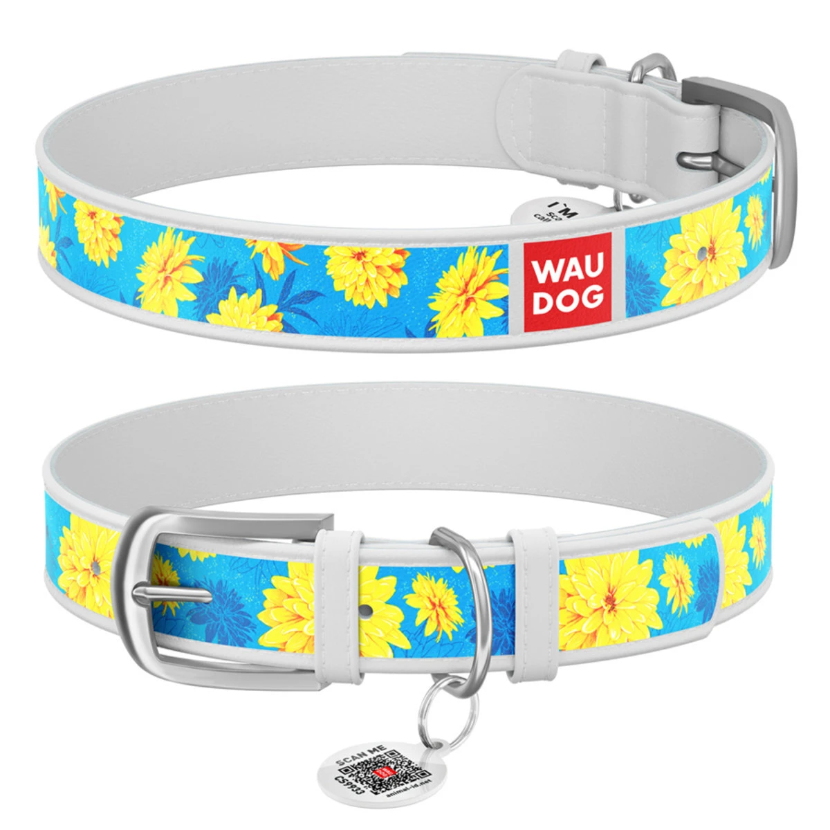 Нашийник WAUDOG Design з малюнком "Квіти на блакитному", преміум шкіра, металевий пряжка (ширина 25 мм, довжина 38-49 см), білий