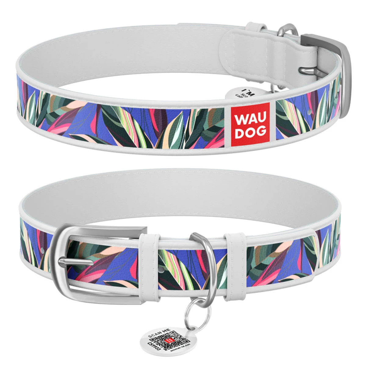 Нашийник WAUDOG Design з малюнком "Листя", преміум шкіра, металевий пряжка (ширина 25 мм, довжина 38-49 см), білий