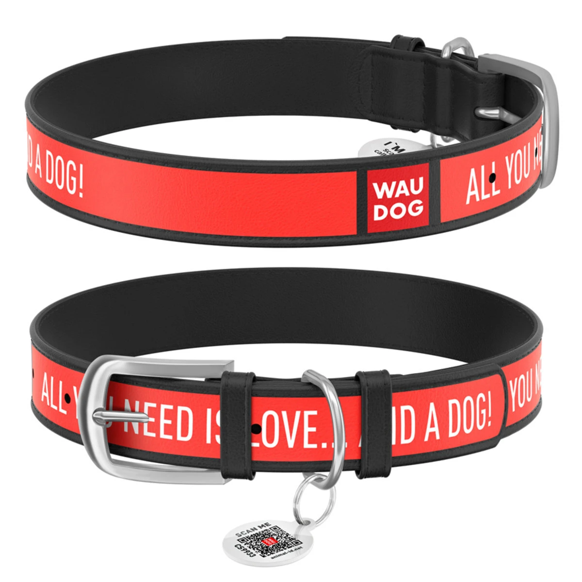 Нашийник WAUDOG Design з малюнком "Любов і собаки", преміум шкіра, металевий пряжка (ширина 20 мм, довжина 30-39 см), чорний