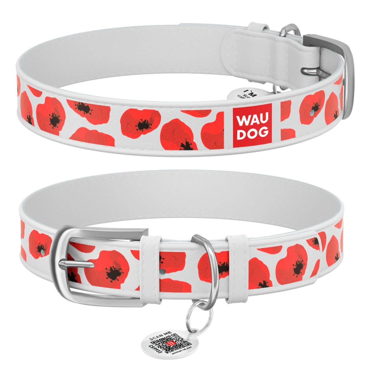 Нашийник WAUDOG Design з малюнком "Макі", преміум шкіра, металевий пряжка (ширина 35 мм, довжина 46-60 см), білий