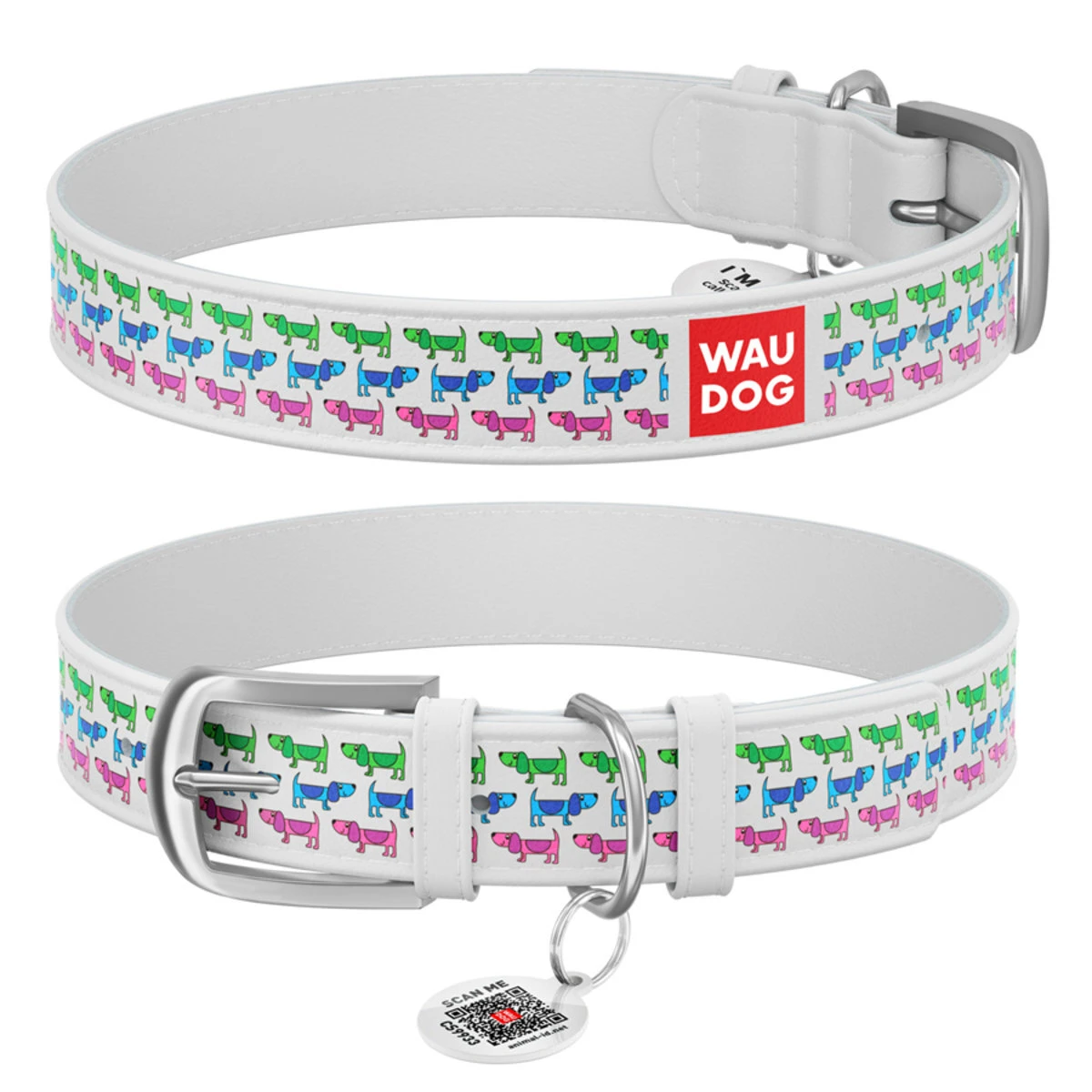 Нашийник WAUDOG Design з малюнком "Парад собачок", преміум шкіра, металевий пряжка (ширина 15 мм, довжина 27-36 см), білий