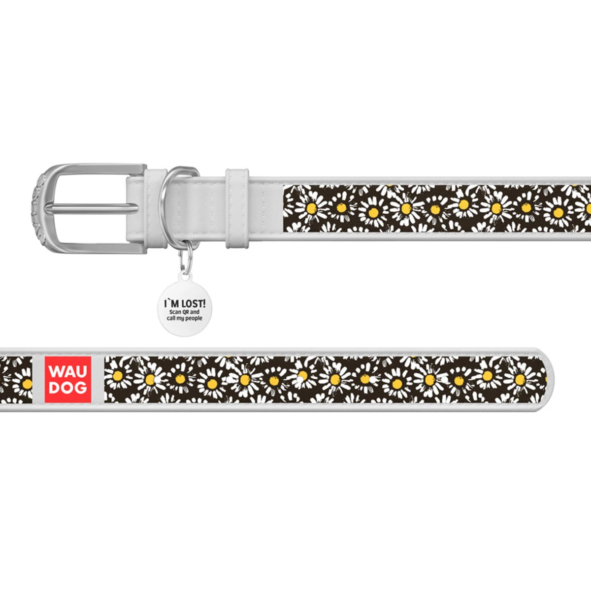 Нашийник WAUDOG Design з малюнком "Ромашки", преміум шкіра, металевий пряжка (ширина 12 мм, довжина 19-25 см), білий