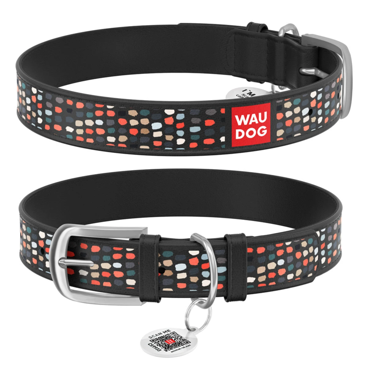 Нашийник WAUDOG Design з малюнком "Смішні точки", преміум шкіра, металевий пряжка (ширина 35 мм, довжина 46-60 см), чорний