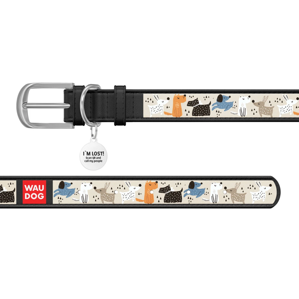 Нашийник WAUDOG Design з малюнком "Собачки на прогулянці", преміум шкіра, металевий пряжка (ширина 15 мм, довжина 27-36 см), чорний