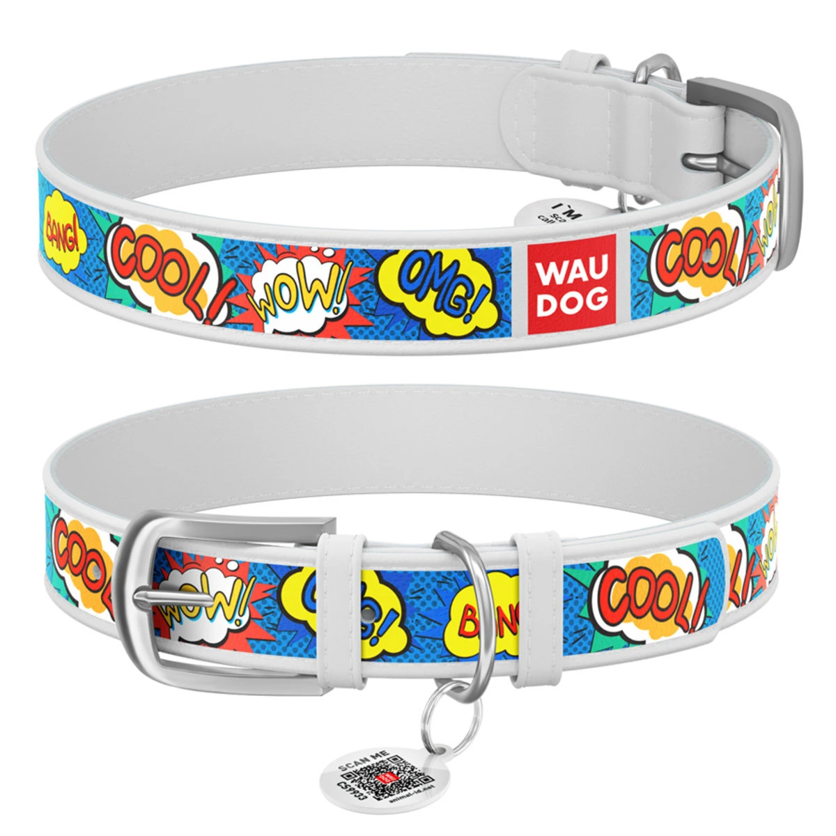 Нашийник WAUDOG Design з малюнком "ВАУ", преміум шкіра, металевий пряжка (ширина 35 мм, довжина 46-60 см), білий