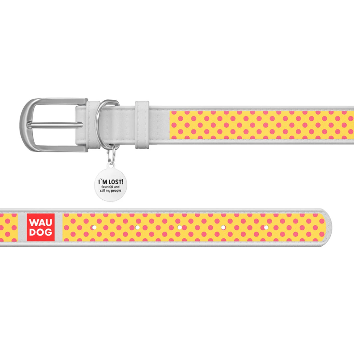 Нашийник WAUDOG Design з малюнком "Жовта полька", преміум шкіра, металевий пряжка (ширина 12 мм, довжина 21-29 см), білий