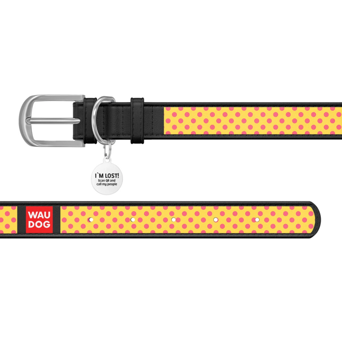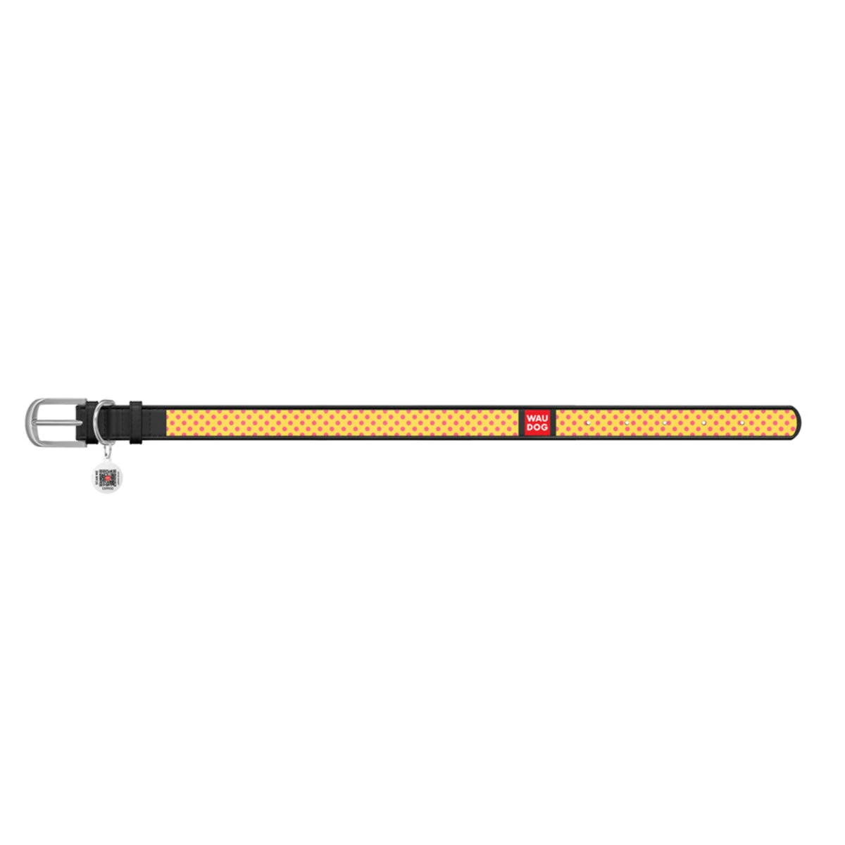 Нашийник WAUDOG Design з малюнком "Жовта полька", преміум шкіра, металевий пряжка (ширина 15 мм, довжина 27-36 см), чорний