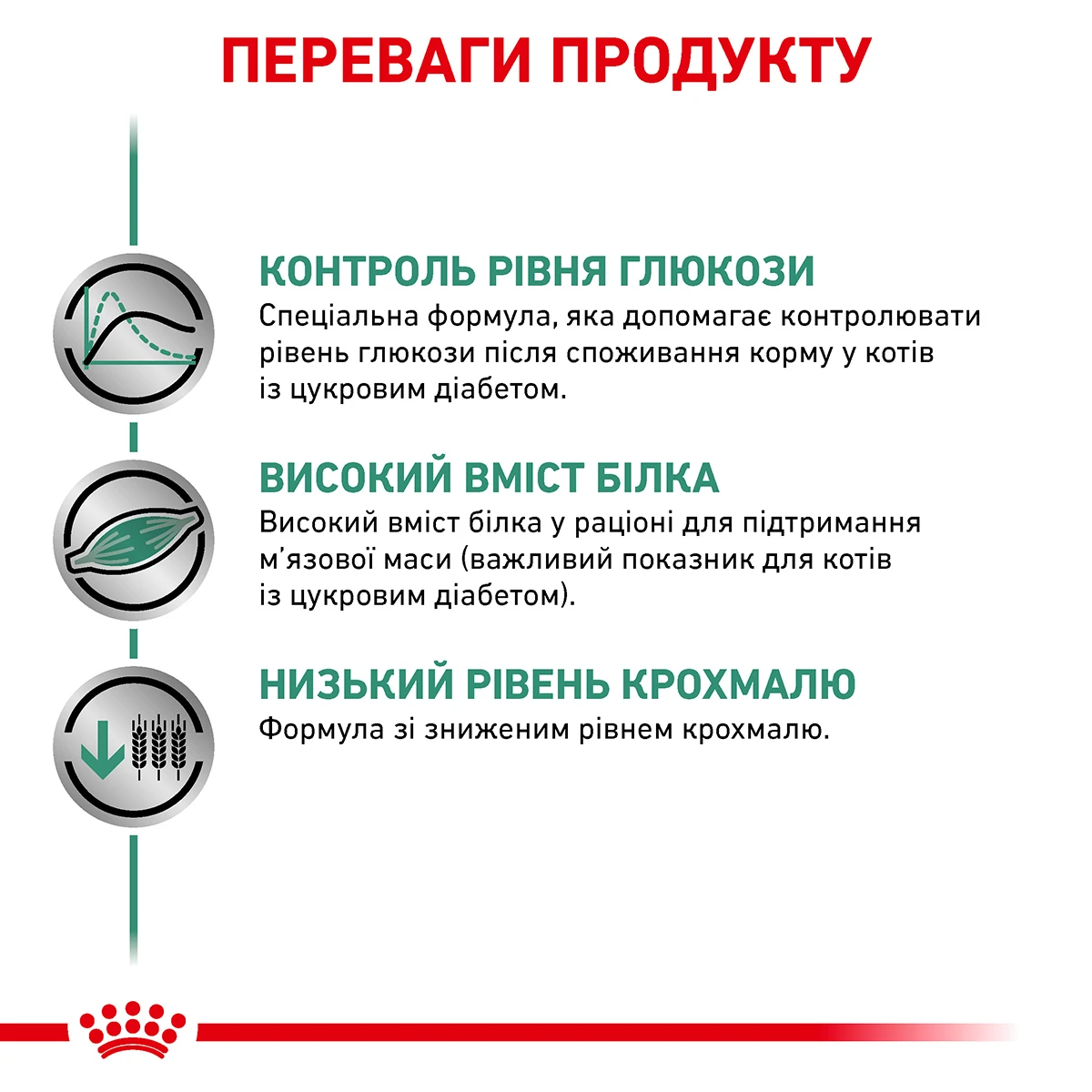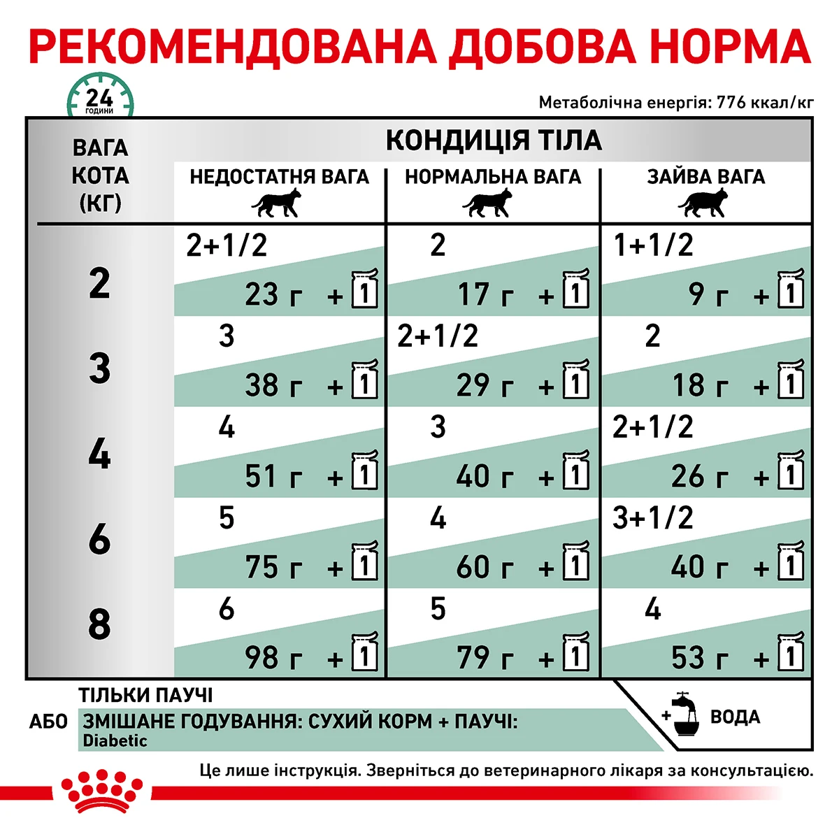 Увага! При годуванні раціоном diabetic у котів значно підвищується чутливість до інсуліну. На початку застосування дієти рекомендується контролювати рівень глюкози в крові для корекції дози інсуліну. Після досягнення контролю глікемії дієту потрібно корегувати, в залежності від кондиції тіла тварини.