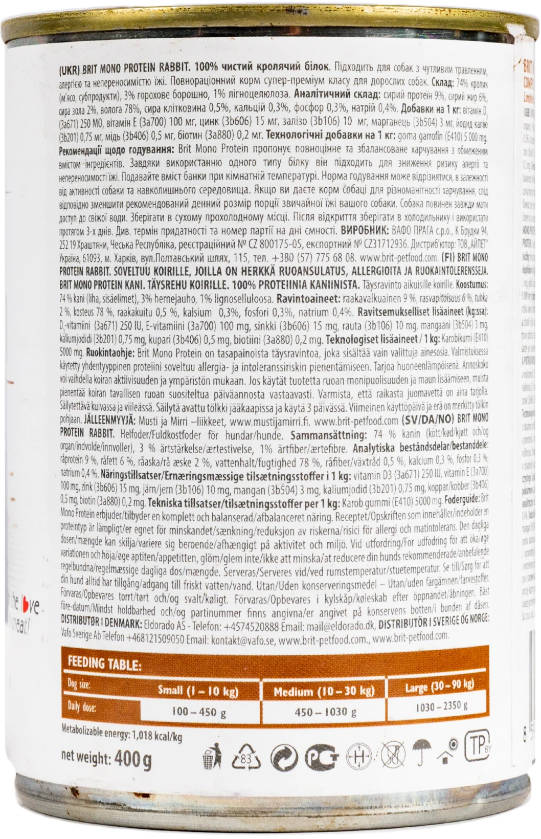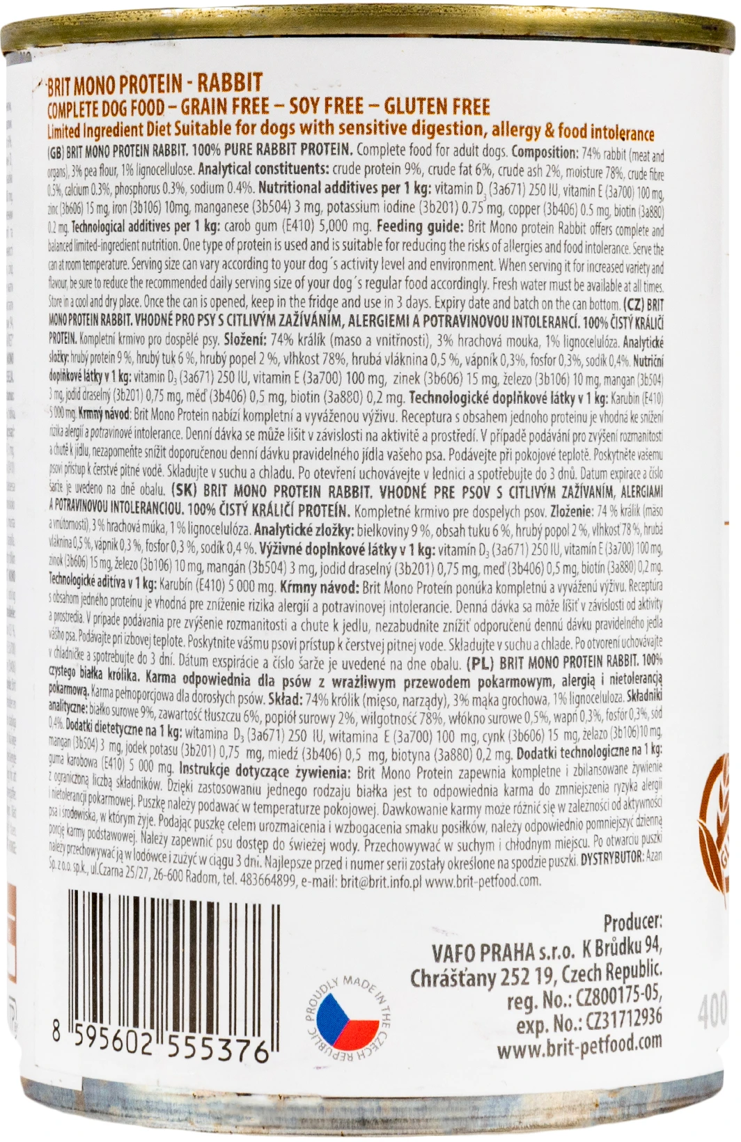биотин (3a880) 0, витамин E (3a700) 100 мг, железо (3b106) 10 мг, йодид калия (3b201) 0, марганец (3b504) 3 мг, медь (3b406) 0, цинк (3b606) 15 мг, 1% гороховое волокно. Добавки: витамин D3 (3a671) 250 ME, 2 мг. Технологические добавки на 1 кг: камедь бобов рожкового дерева (E410) 5000 mg., 3% гороховый крахмал, 5 мг, 74% кролик (мясо и органы), 75 мг