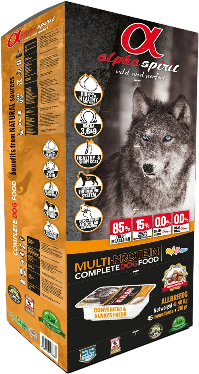 Полувологий беззерновий корм Alpha Spirit Multiprotein — повноцінне харчування для собак на всіх стадіях життя.