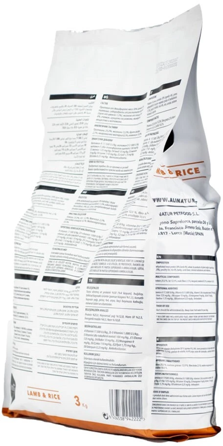 СОСТАВ: Дегидрированное мясо 30% (ягненок 4%), пшеница, субпродукты растительного происхождения (свекольный жмых 1.5%), птичий жир, рис 4%, ячмень, стручок рожкового дерева, витамины и минералы.