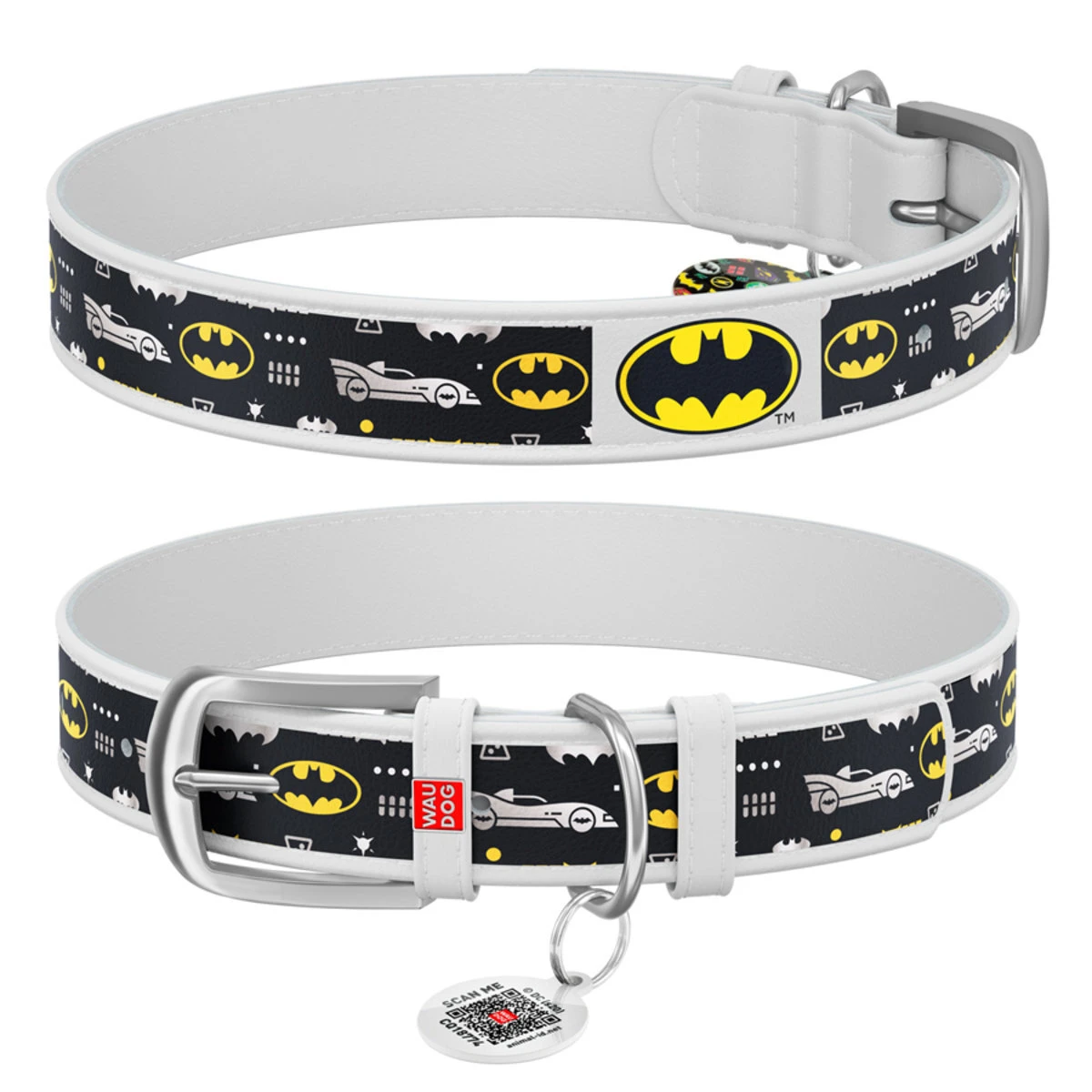 Ошейник для собак кожаный WAUDOG Design с QR паспортом, рисунок "Бэтмен3", Ш 25 мм, Дл 37-48 см, белый