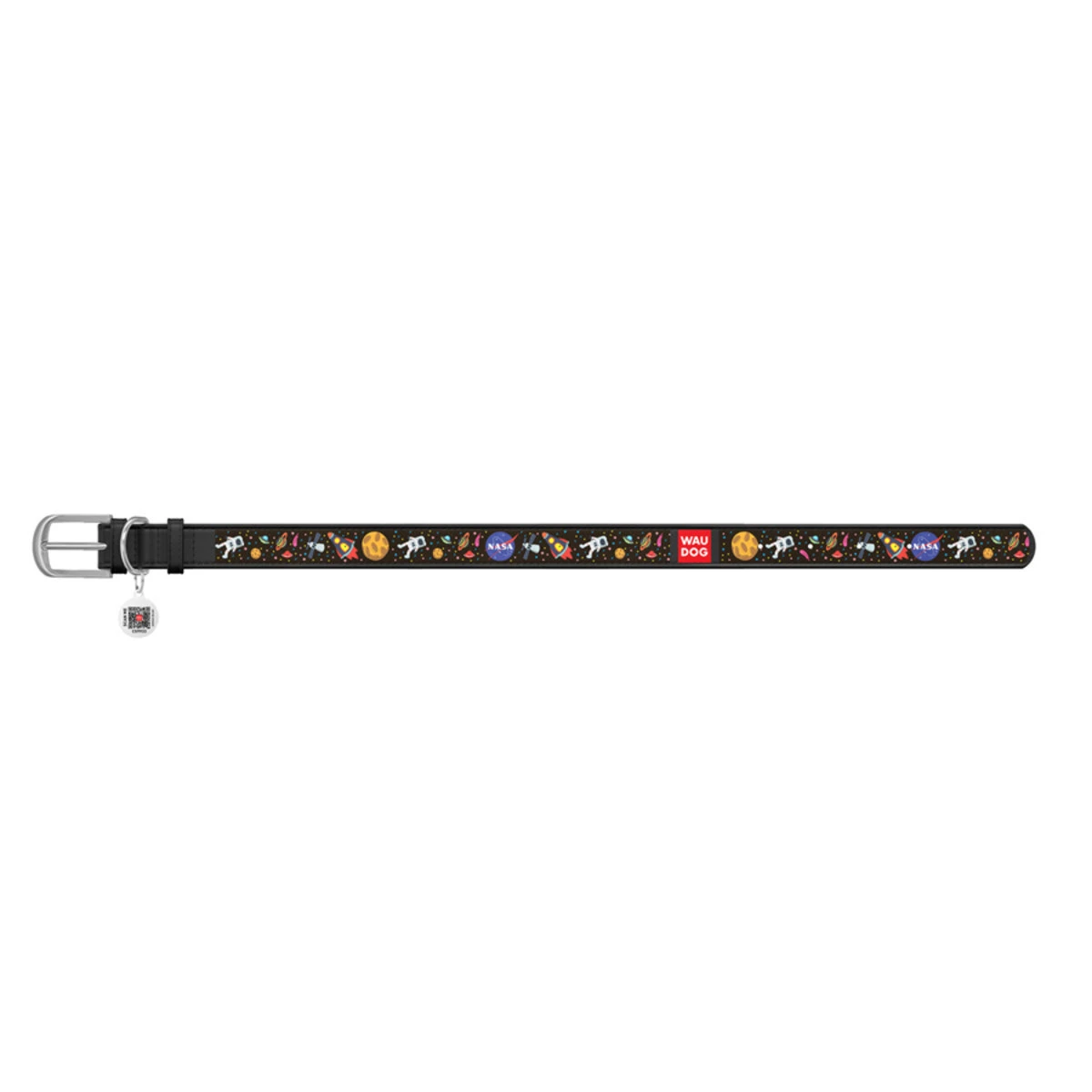 Ошейник для собак кожаный WAUDOG Design с QR паспортом, рисунок "NASA", Ш 12 мм, Дл 21-29 см, черный