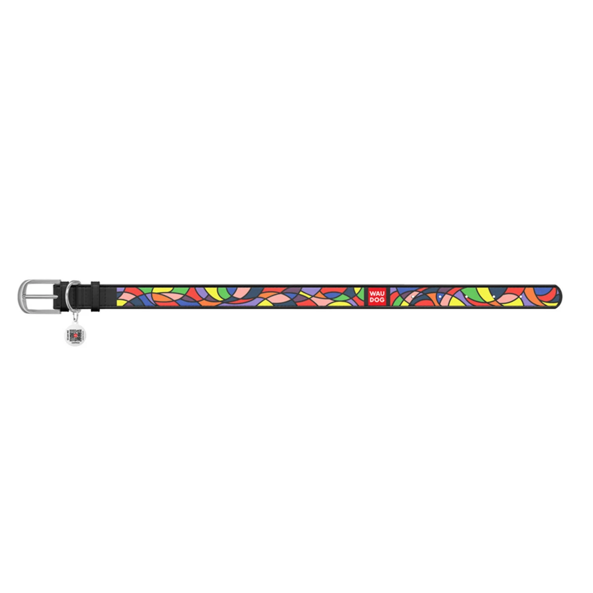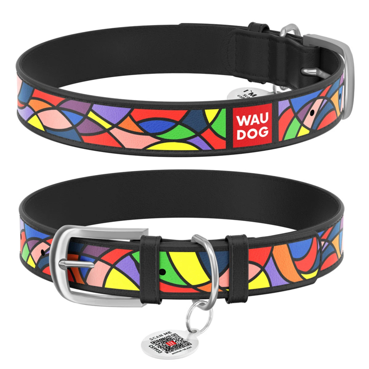 Ошейник для собак кожаный WAUDOG Design с QR паспортом, рисунок "Витраж", Ш 25 мм, Дл 38-49 см, черный