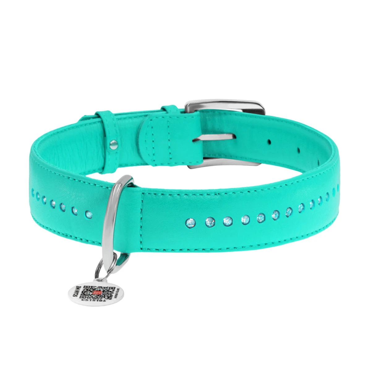 Ошейник для собак кожаный WAUDOG Glamour с QR паспортом, двойной со стразами, Ш 15 мм, Дл 27-36 см, ментоловый
