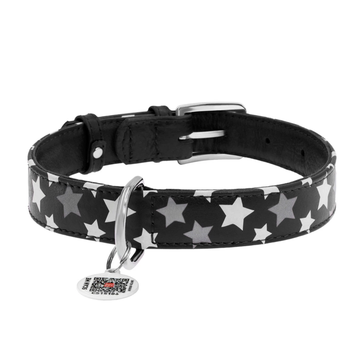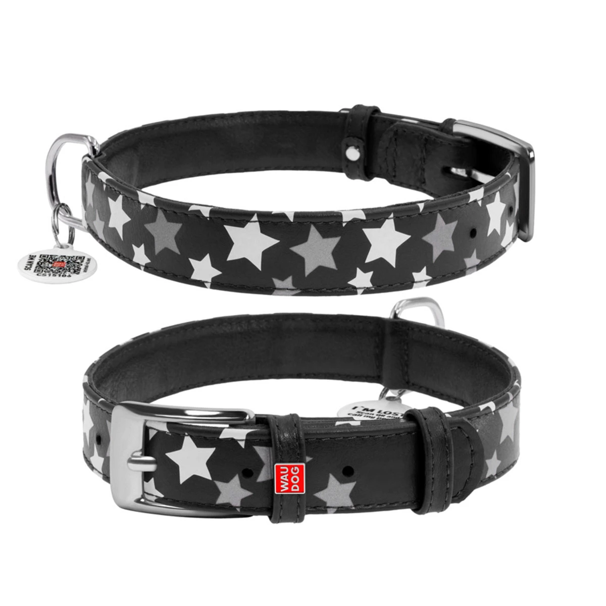 Ошейник для собак кожаный WAUDOG Glamour с QR паспортом, узор "Звёздочка", светящийся/светоотражающий, Ш 25 мм, Дл 38-49 см, черный