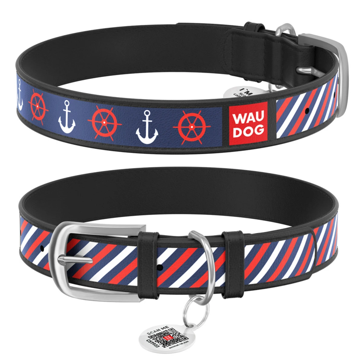 Ошейник WAUDOG Design с рисунком "Якоря 2", премиум кожа, металлическая пряжка (ширина 12 мм, длина 19-25 см), черный