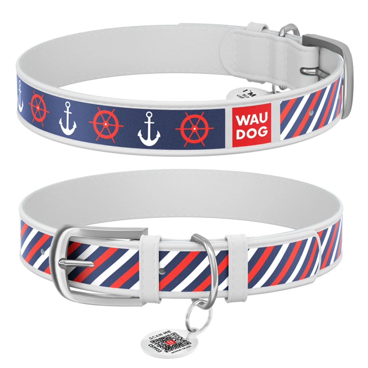Ошейник WAUDOG Design с рисунком "Якоря 2", премиум кожа, металлическая пряжка (ширина 12 мм, длина 21-29 см), белый