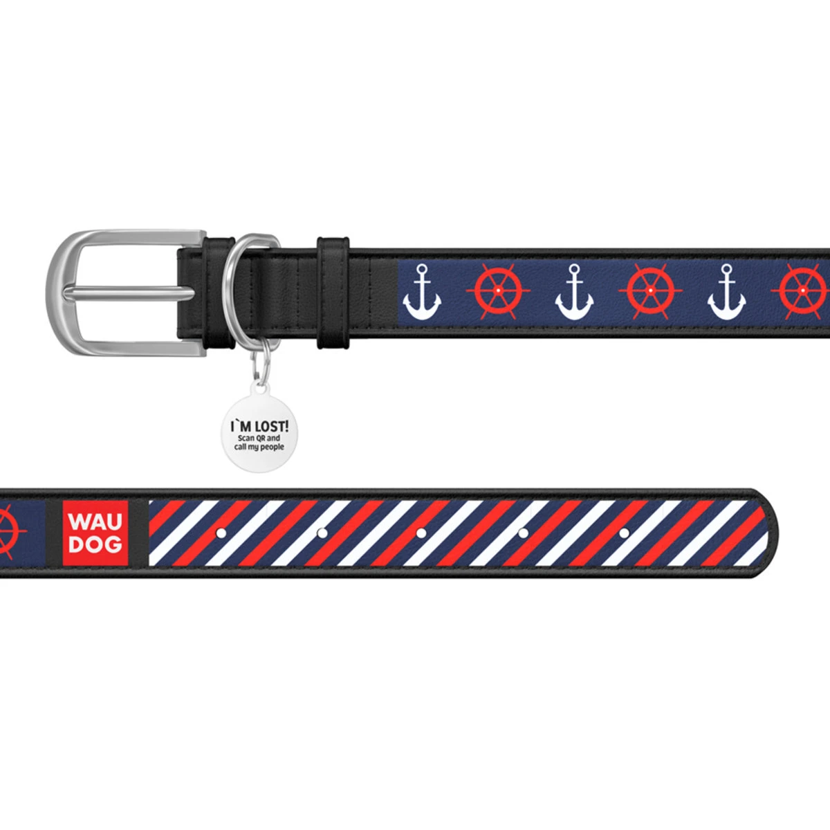 Ошейник WAUDOG Design с рисунком "Якоря 2", премиум кожа, металлическая пряжка (ширина 15 мм, длина 27-36 см), черный