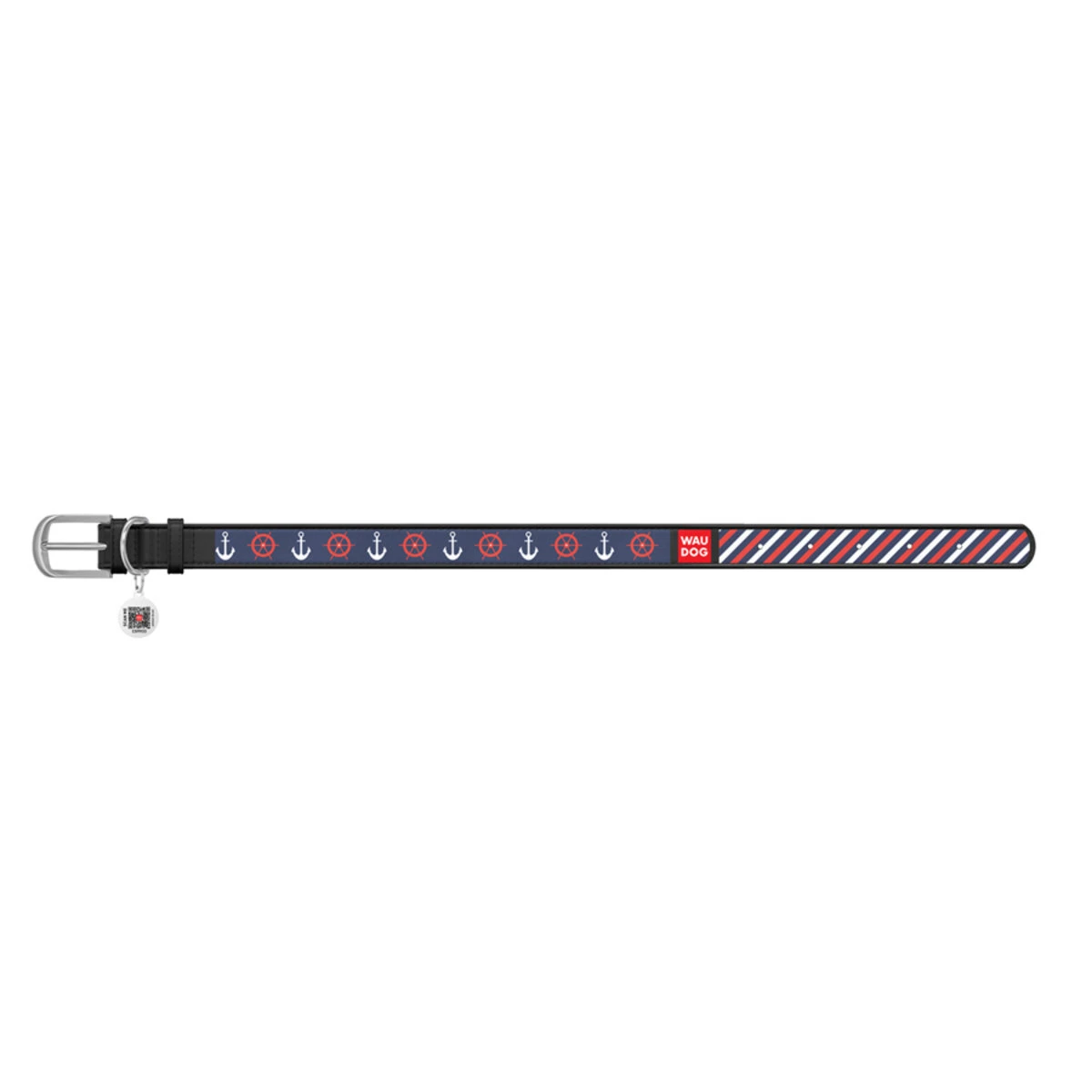 Ошейник WAUDOG Design с рисунком "Якоря 2", премиум кожа, металлическая пряжка (ширина 35 мм, длина 46-60 см), черный