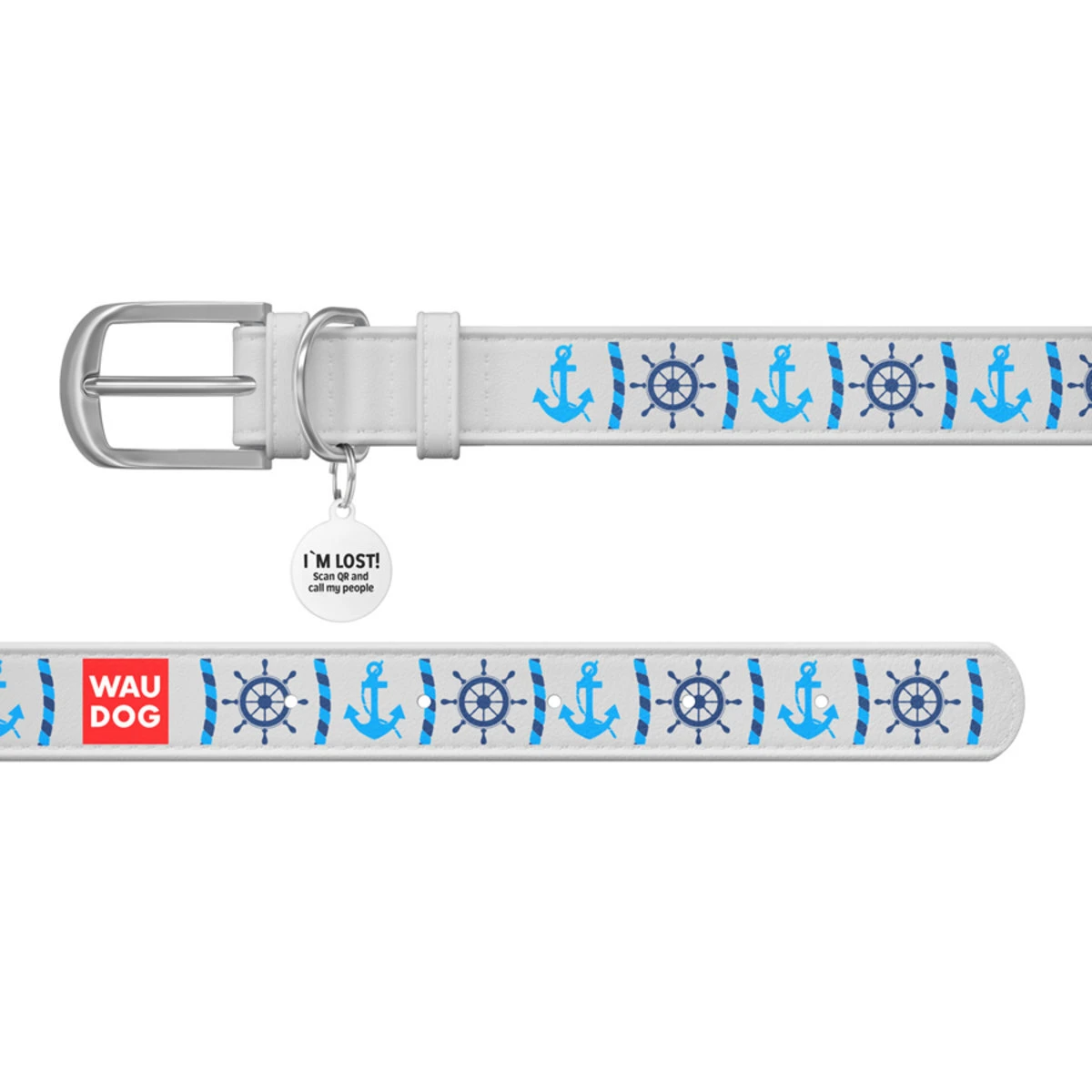 Ошейник WAUDOG Design с рисунком "Якоря", премиум кожа, металлическая пряжка (ширина 12 мм, длина 21-29 см), белый