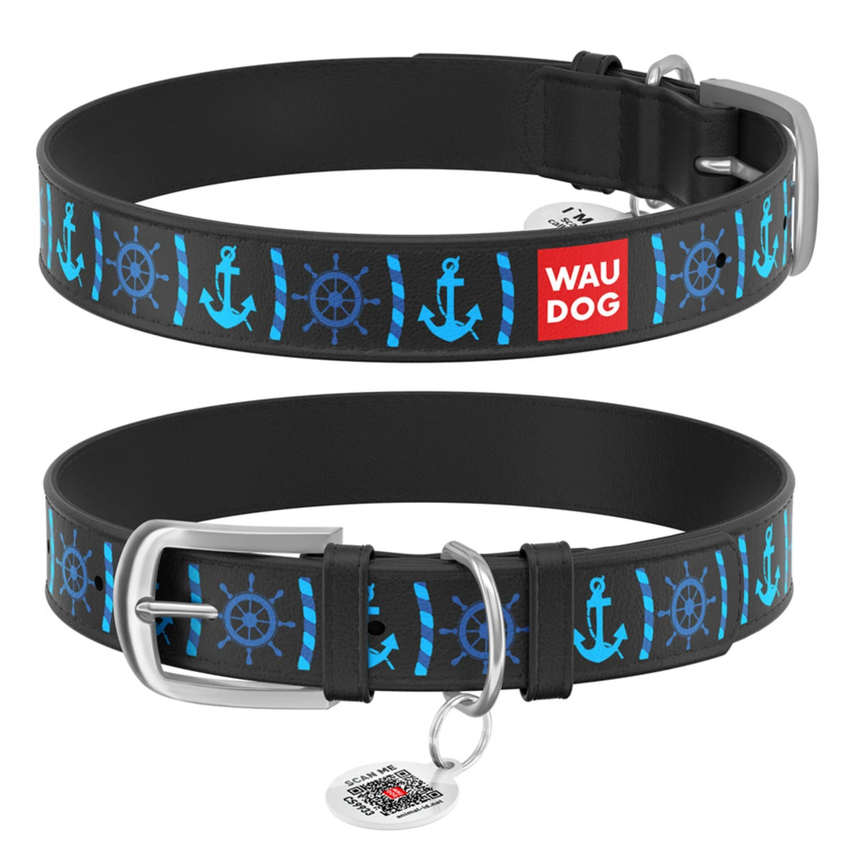 Ошейник WAUDOG Design с рисунком "Якоря", премиум кожа, металлическая пряжка (ширина 25 мм, длина 38-49 см), черный