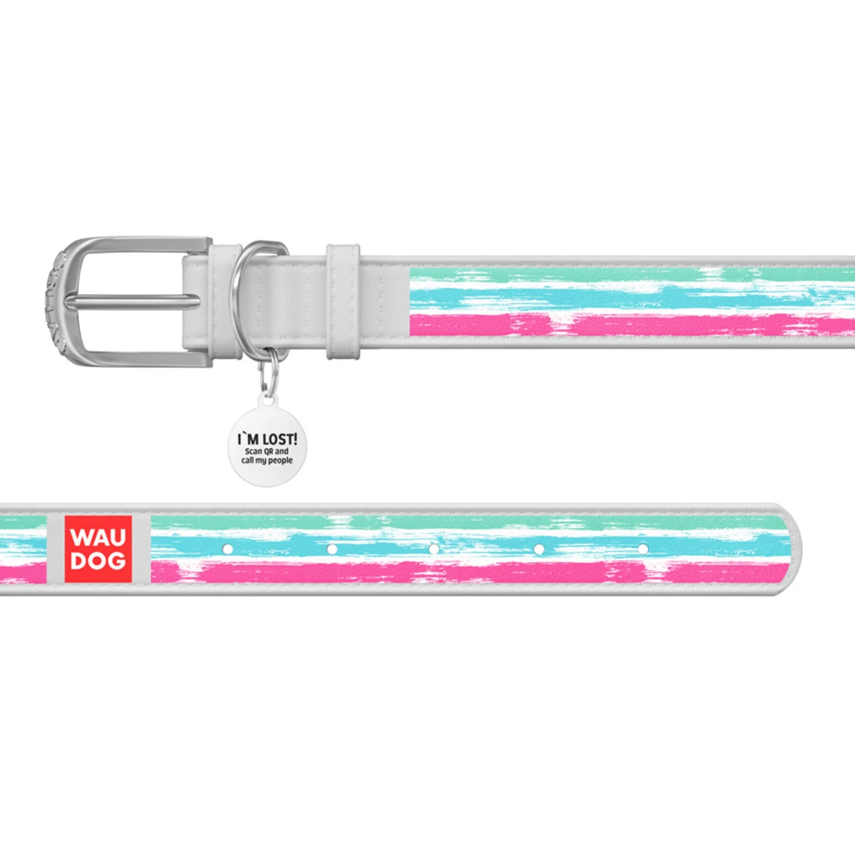 Ошейник WAUDOG Design с рисунком "Акварельные полоски", премиум кожа, металлическая пряжка (ширина 25 мм, длина 38-49 см), белый