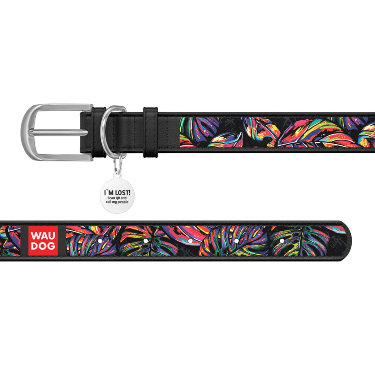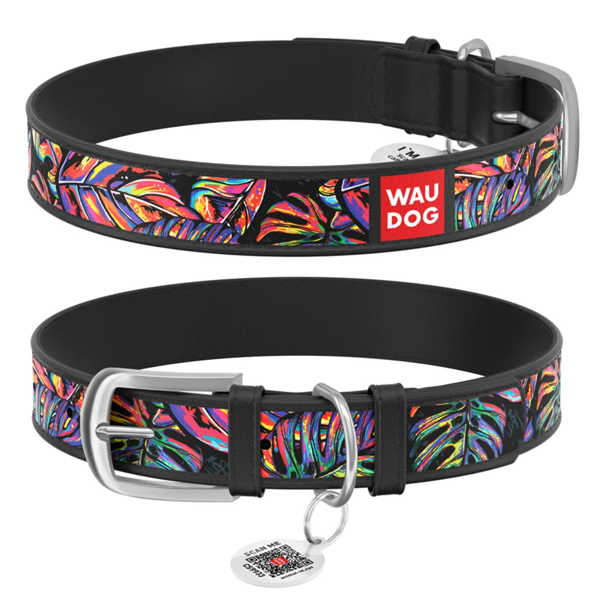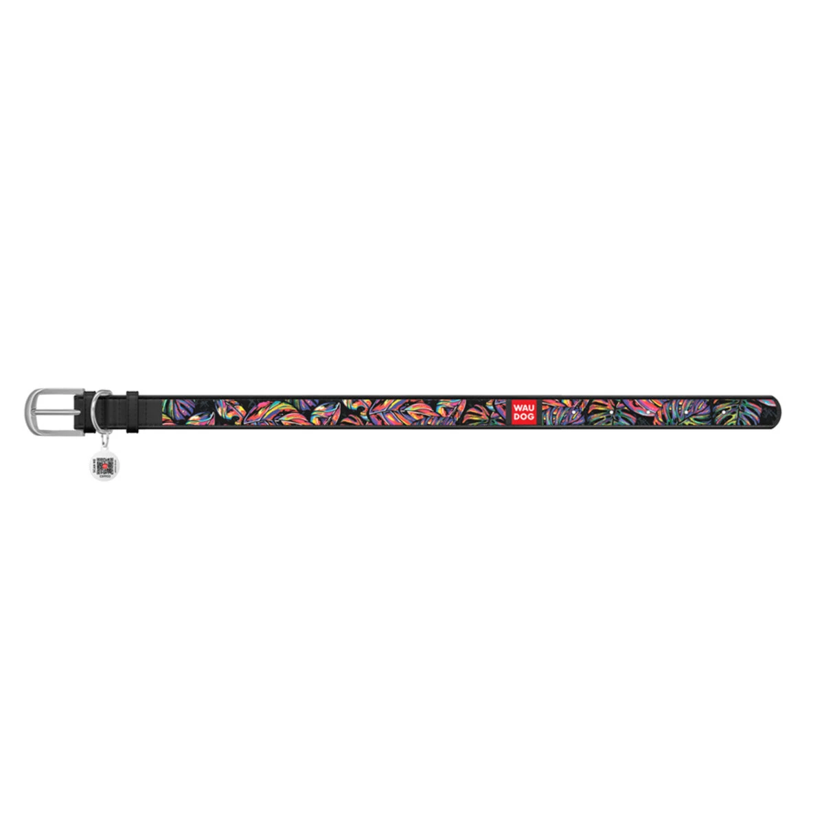 Ошейник WAUDOG Design с рисунком "Яркий тропик", премиум кожа, металлическая пряжка (ширина 15 мм, длина 27-36 см), черный
